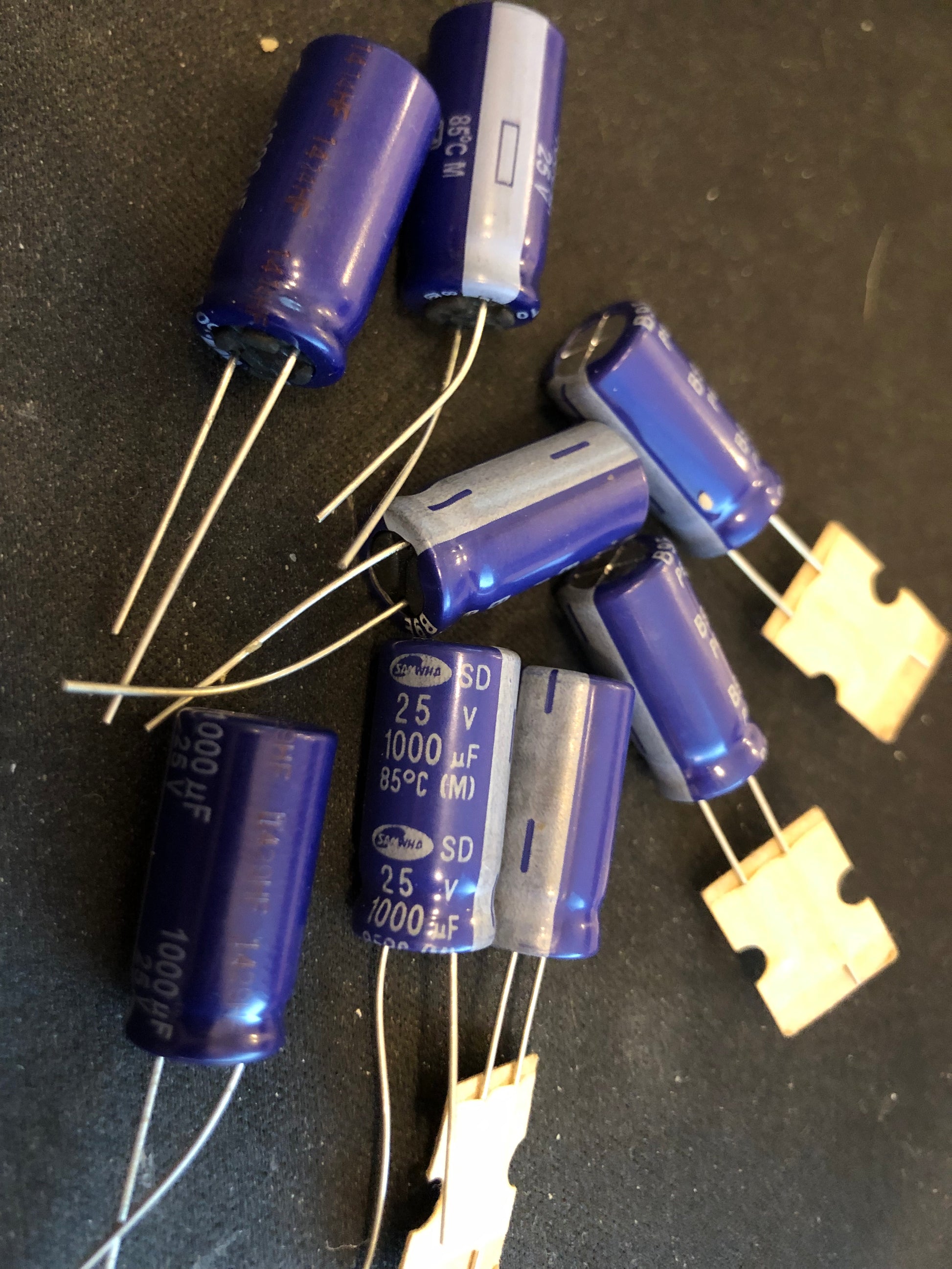 8 x 1000µf 25v Radial Electrolytic Capacitors, new. Two different manufacturers (looks like Panasonic and Samana). Lot is for just the eight that you see just so nobody is confused. Images do an adequate job of representing the lot which is untested but guaranteed against DOA. Please feel free to ask questions before buying - you will find I am very responsive to all inquiries.