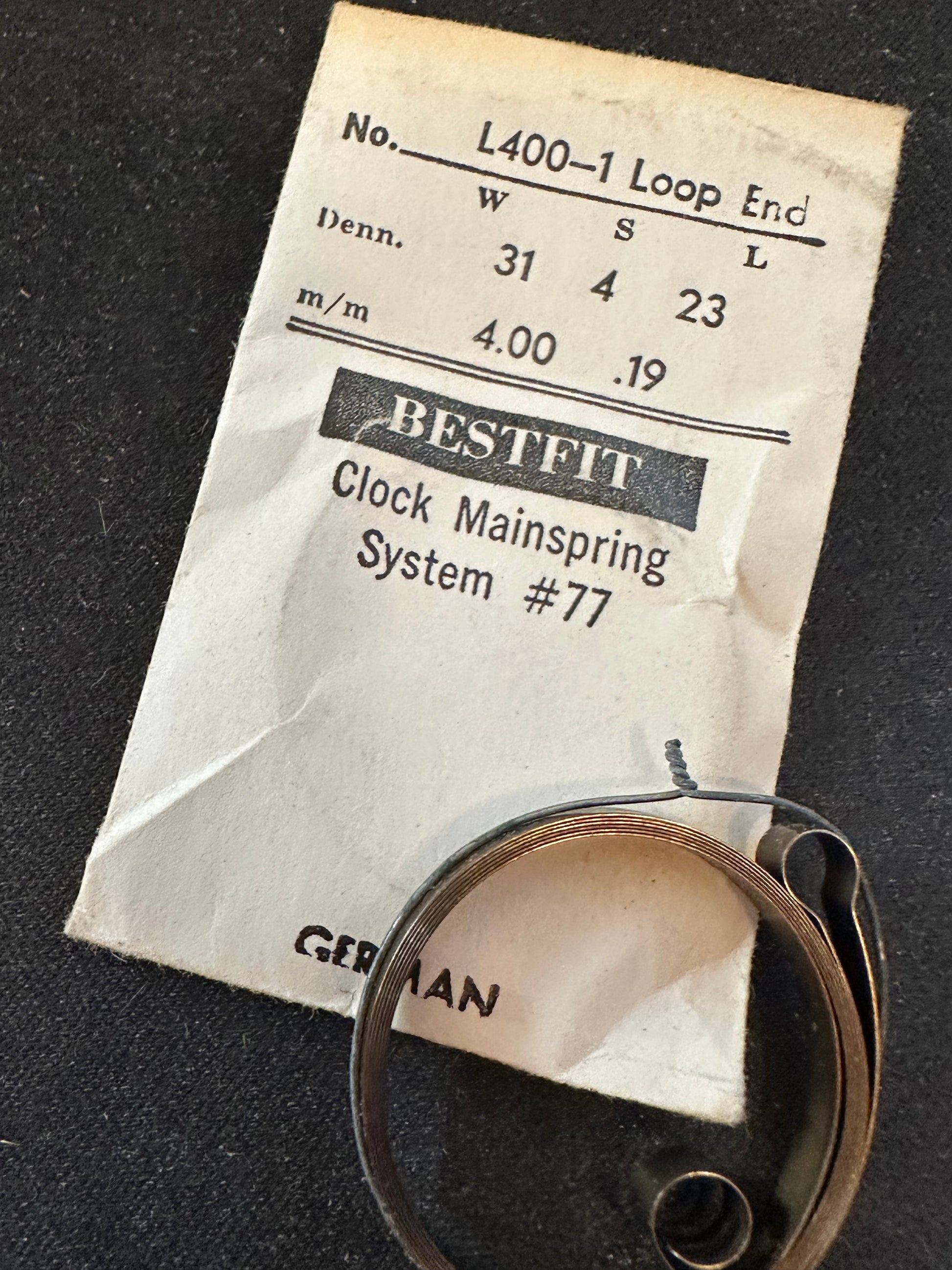 Bestfit System #77 Clock Mainspring suitable for Bayard B-200 Alarm clock, specifically the ALARM spring, and likely other clocks as well, LOOP end, No. L400-1, steel, new in envelope. See images for precise mainspring specifications. I specialize is hard to find watch & clock parts and all parts are unconditionally guaranteed. Images do a pretty good job of representing the item