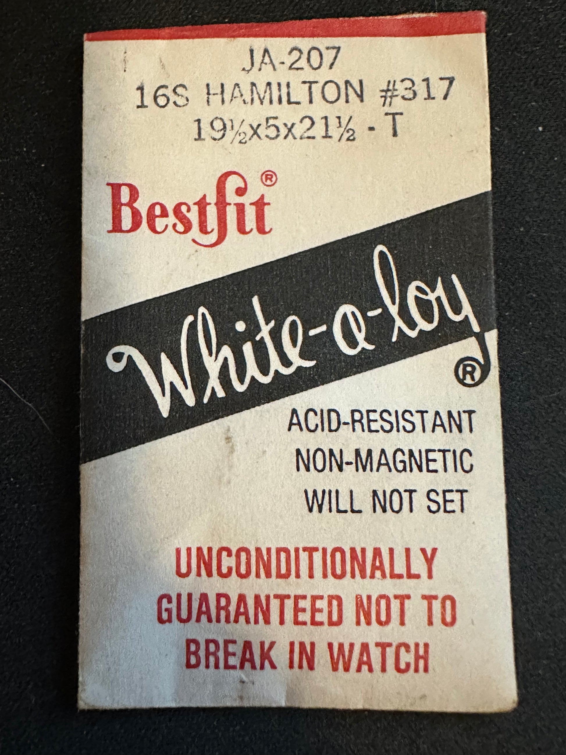 BESTFIT Mainspring JA-207 for Hamilton 16s Movements, Factory No's 317 / 718041, T-end, alloy, new in envelope. See images for precise mainspring specifications. I likely have several of these so the one you get may differ slightly from the images. I specialize in hard to find watch parts so I usually have whatever you might need and all watch parts are unconditionally guaranteed. Images do a pretty good job of representing the item.