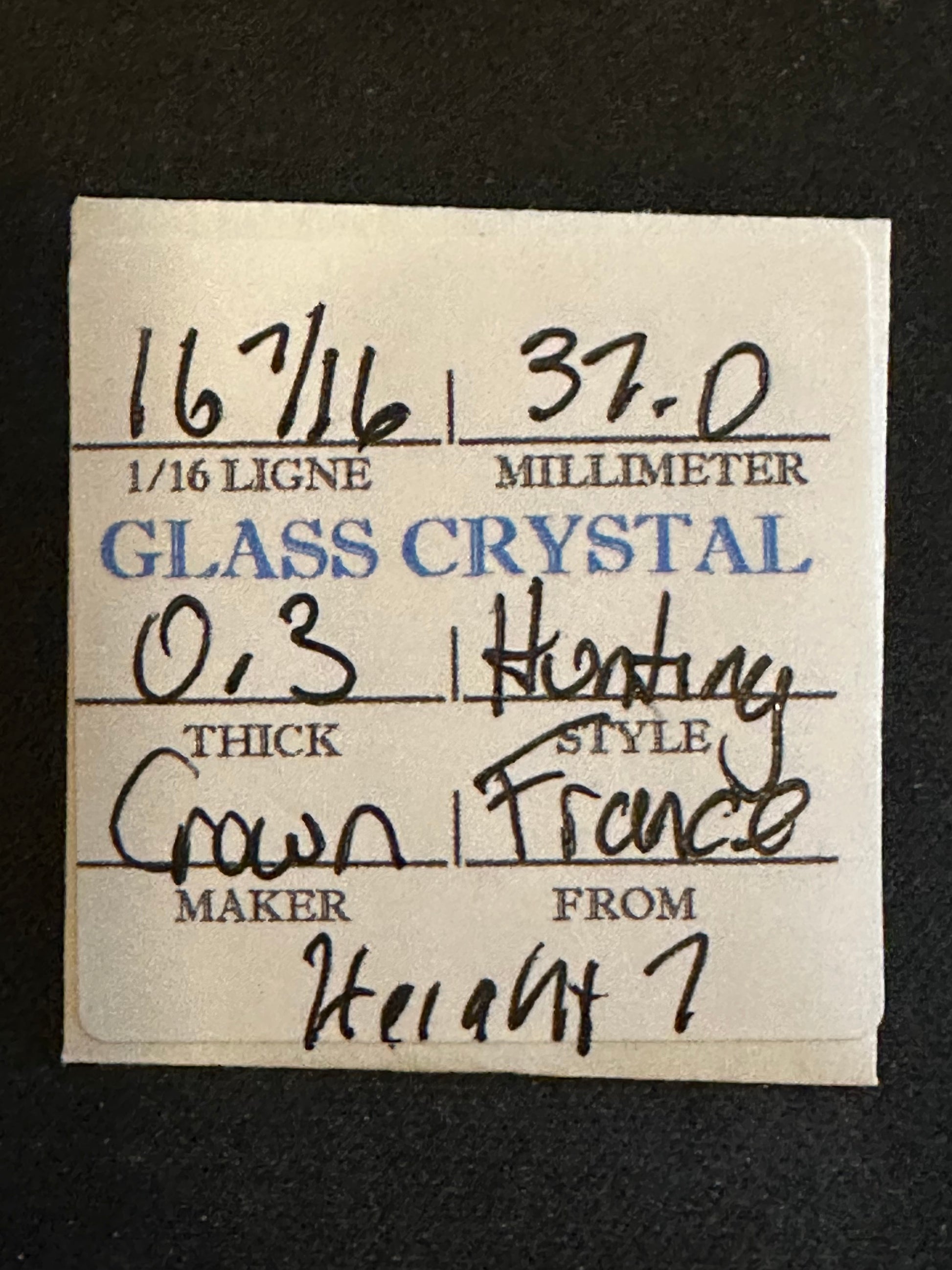 Crown Vintage Glass Hunting Case Watch Crystal size 16-7/16 = ~37.0mm (marked), 0.3mm thick (really thin) and with a height of 7, new old stock. This is a very thin low profile glass hunting crystal for a hunting case movement with a flatter profile in the center than most other makers. These come from glass crystal cabinets that are easily well over 100 years old, so they give real meaning to the term NOS. That said, in my 40 years of experience with them I've not found the older crystals to be any more or less brittle than anything you could find today, if they made them today. I likely have several of these so the one you get may differ slightly from the images. Glass Hunting crystals take great care in installation so I'll package them so they arrive as described, but you're responsible for proper installation. I have a supply of crystals that numbers in the hundreds of thousands so I can usually supply just about any size Watch Crystal you need (glass or acrylic) so feel free to inquire. Images do an adequate job of representing the item.