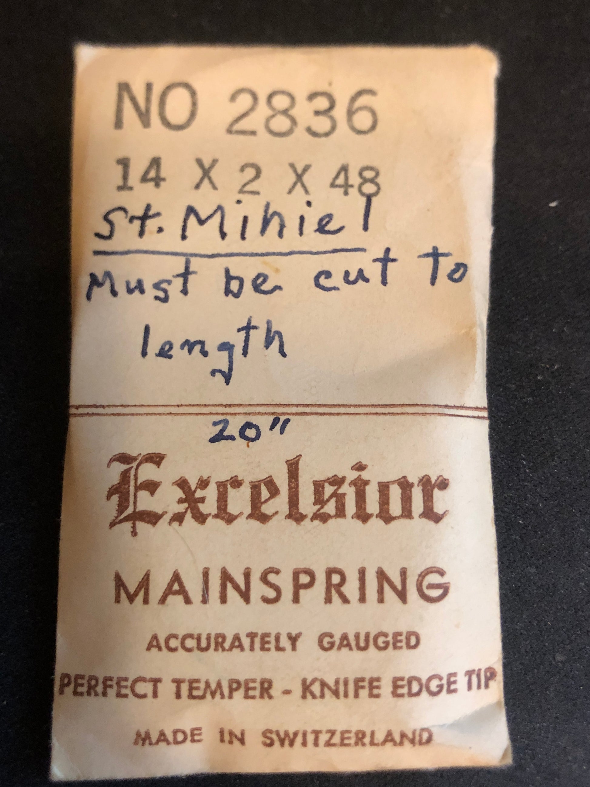 Excelsior No. 2836 Mainspring for Alarm and Travel Clocks the 1930's and beyond, steel, new in envelope. Made for 8-Day clocks, this could also fit in other types of clocks (and perhaps even some 8 day watches as well). Measures a Dennison 14 x 2 x 48 - see images for further information, although I encourage you to ignore the writing that says this is a fit if cut down as cutting a mainspring down is rarely a good idea. I likely have several of these so the one you get may differ slightly from the images. I specialize in hard to find parts so I usually have whatever you might need and all parts are unconditionally guaranteed. Images do a pretty good job of representing the item.