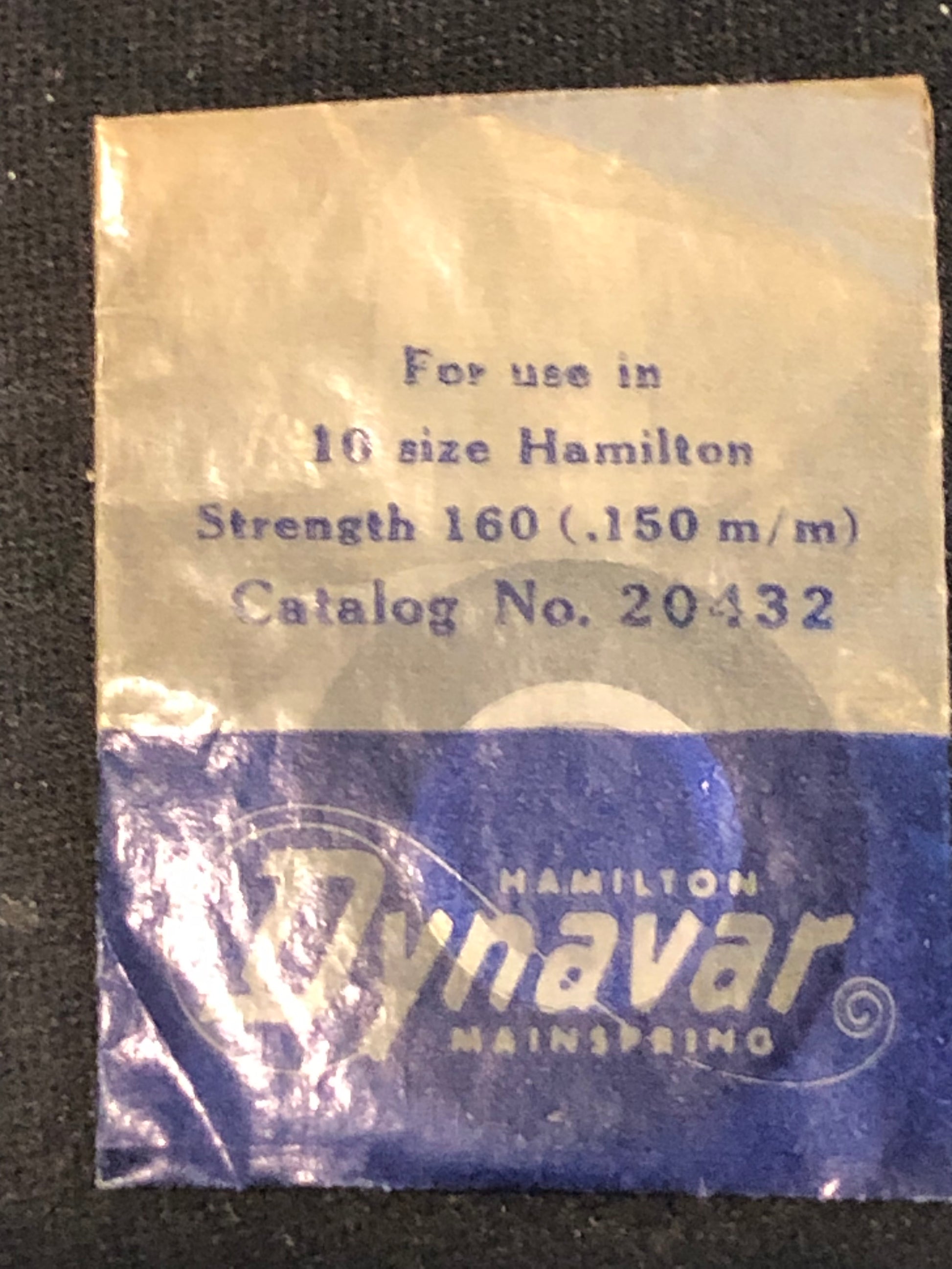 Hamilton Dynavar Factory Mainspring for 10s Movements, more specifically the models 917, 921, 923 and 945, Factory No. 20432, alloy, new in envelope. See image for precise mainspring specifications. I likely have several of these so the one you get may differ slightly from the images. I don't come across these as frequently as I once did so grab them while you can. I specialize is hard to find watch parts and all watch parts are unconditionally guaranteed. Images do a marginally adequate job of representing the item.