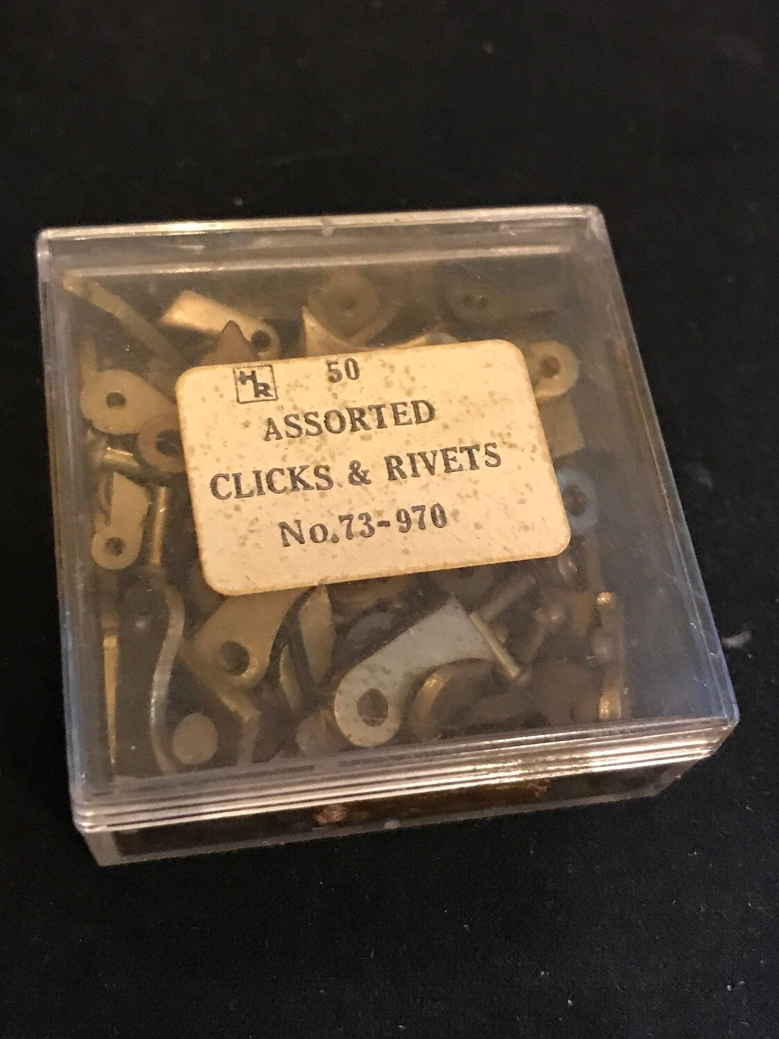 HR 50 pc assortment of Winding Clicks and Rivets for clocks P/N 73-970. I suspect this was an assortment they offered in the 1970's and beyond. Box is unsealed so I suppose it is reasonable to assume a couple may have been consumed. Images do an adequate job of representing the item.