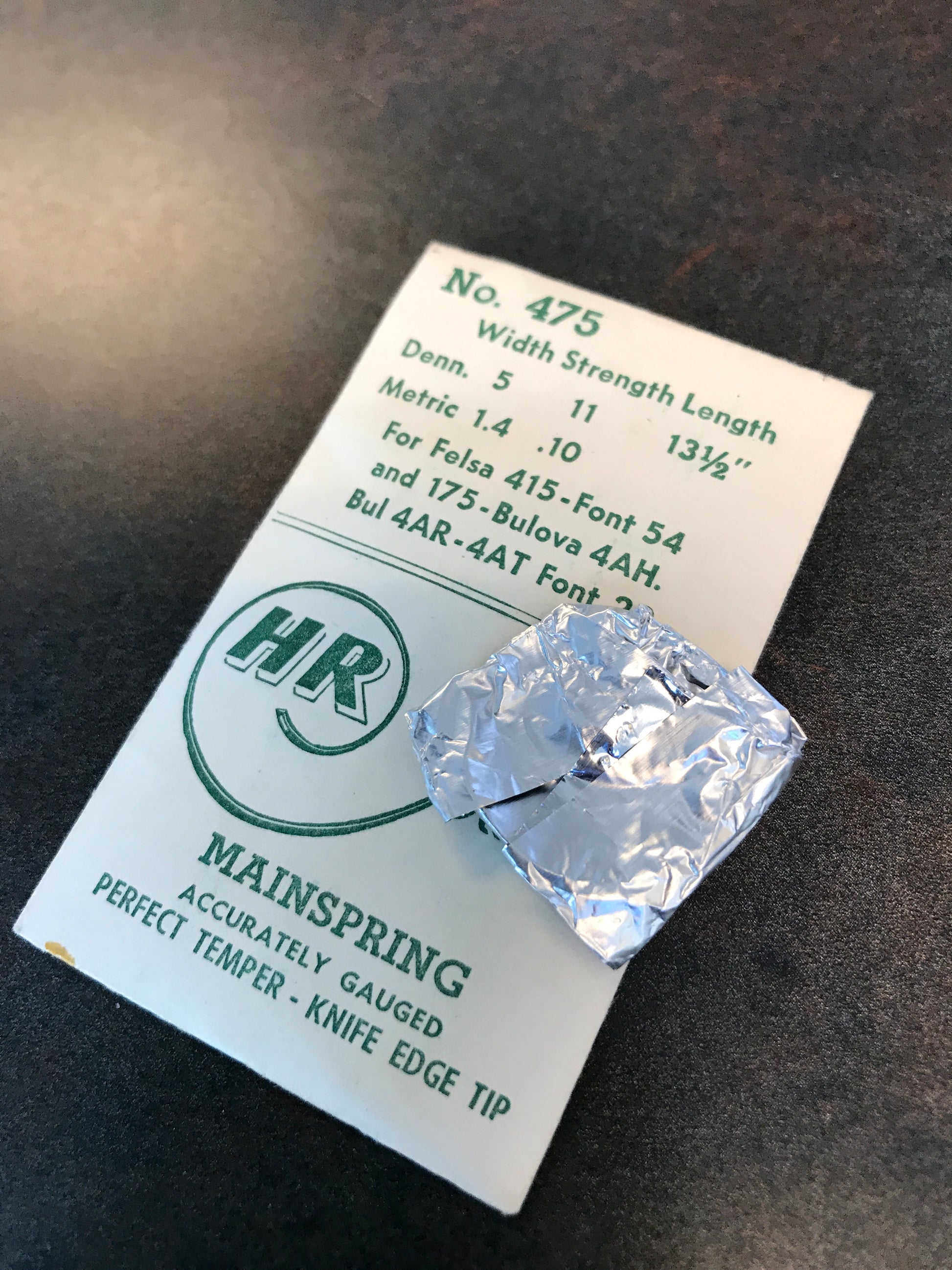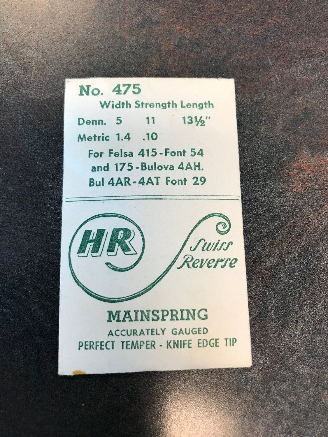 HR No. 475 steel mainspring for Bulova caliber 4AH, Font 29, 54, 175 & Felsa 415, new in frail envelope. See images for precise mainspring specifications. I likely have several of these so the one you get may differ slightly from the images. I specialize in hard to find watch parts so I usually have whatever you might need and all watch parts are unconditionally guaranteed. Images do a pretty good job of representing the item.