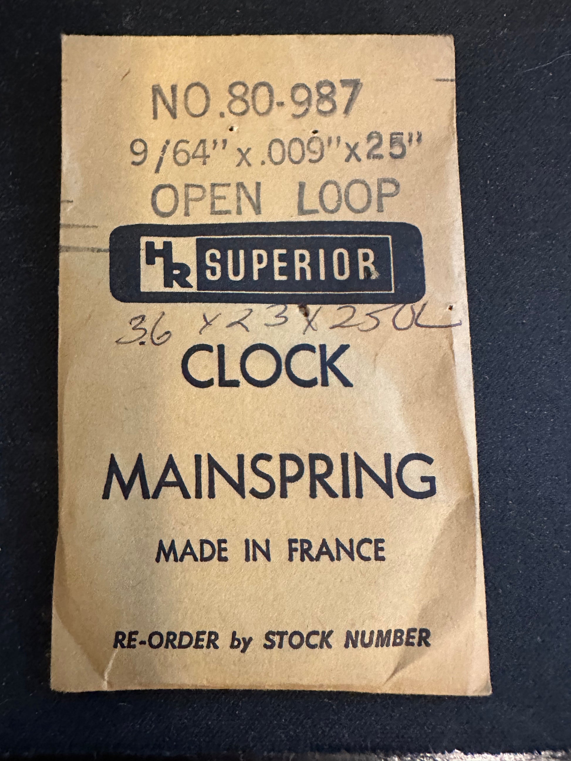 HR Superior Clock Mainspring, Loop End – 9/64″ Width, .009 Strength/Thickness, 25″ Length, P/N 80-987, steel, new in envelope. See images for precise mainspring specifications and further details. I specialize is hard to find watch & clock parts and all parts are unconditionally guaranteed. Images do a pretty good job of representing the item