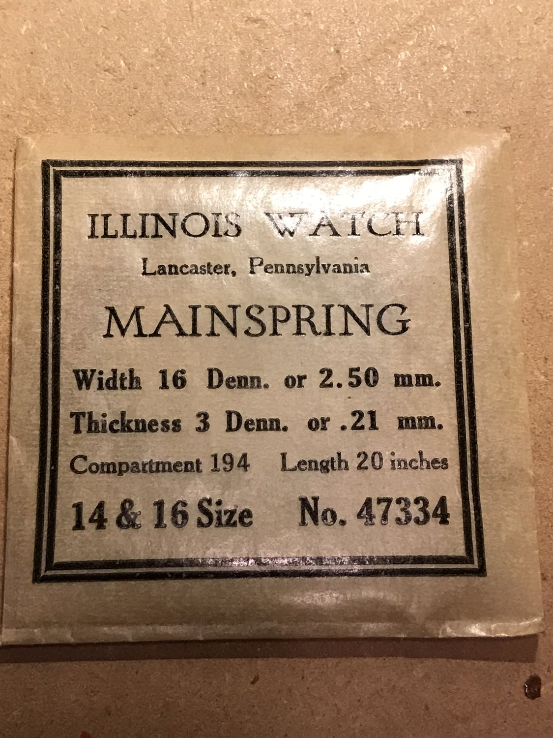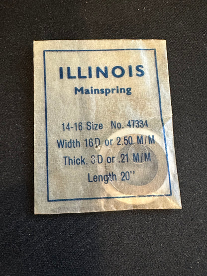 Illinois Factory Mainspring Factory No. 47334 for 14s & 16s movements, steel, new in possibly frail envelope. One of the beautiful thing about factory mainsprings is that they always fit. See images for further details. I likely have several of these so the one you get may differ slightly from the images. I specialize is hard to find watch parts and all watch parts are unconditionally guaranteed. Images do an adequate job of representing the item.