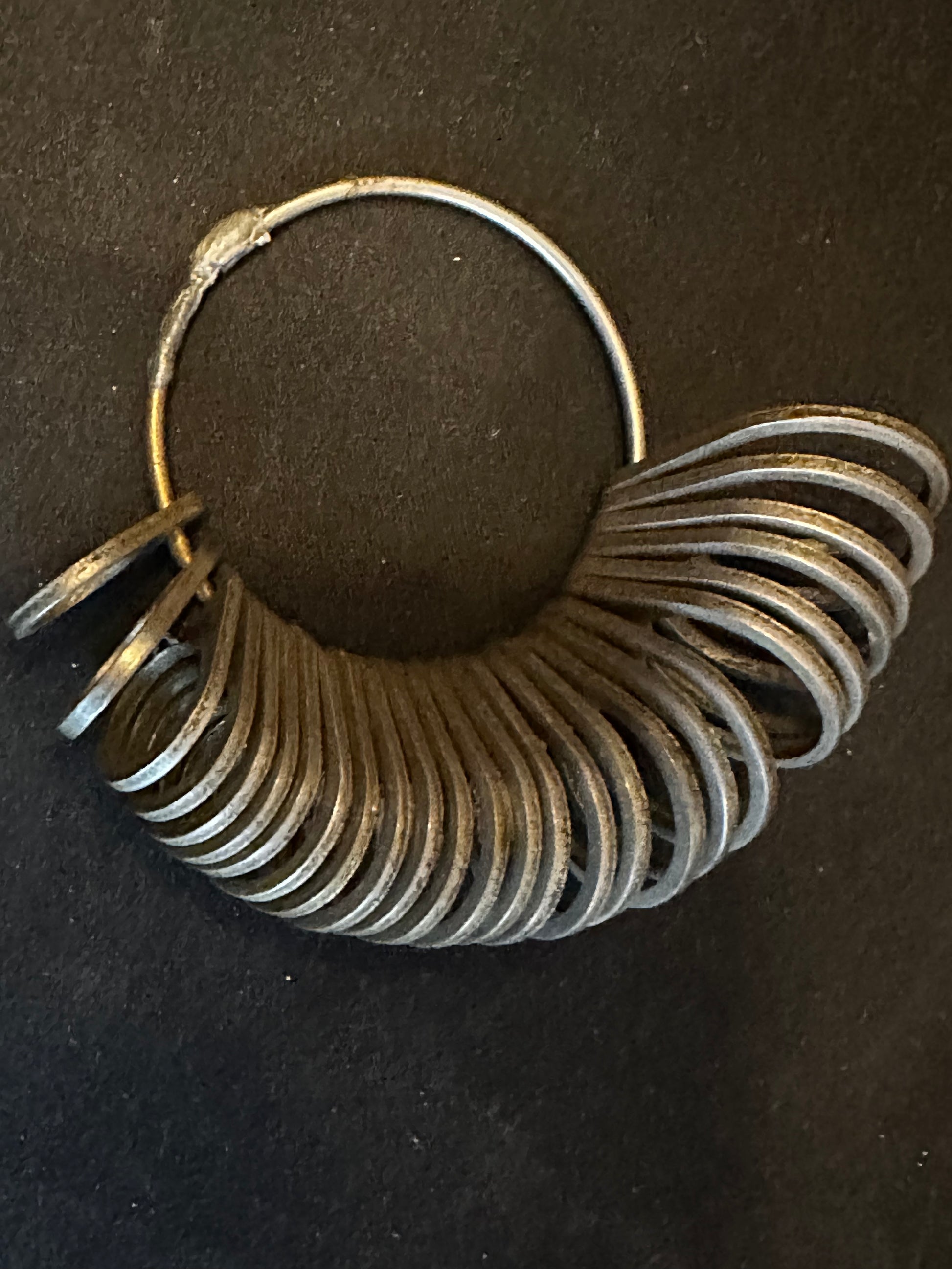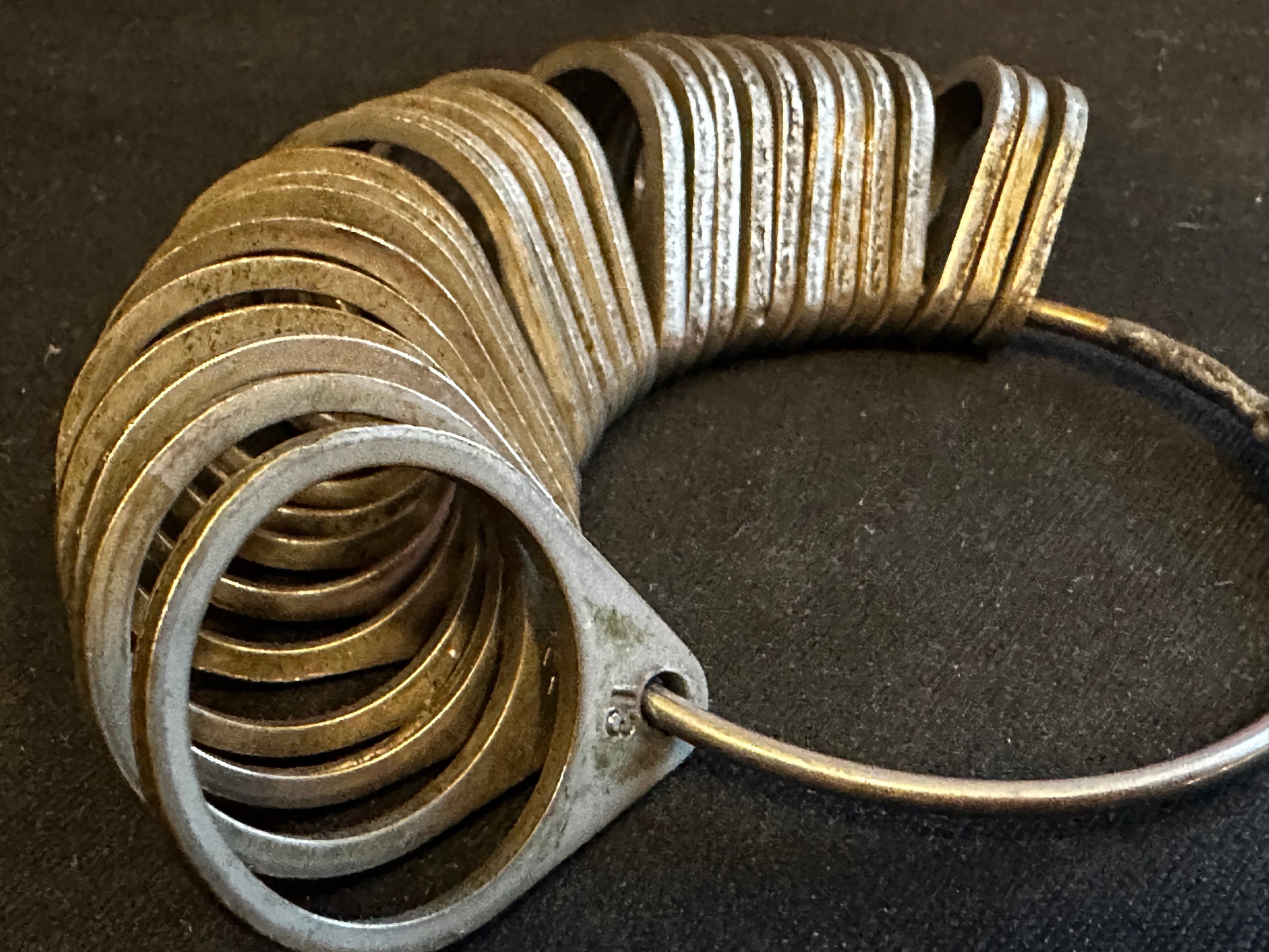 Jewelers 26 position ring finger sizing tool probably from the 1940's or thereabouts, no markings other than sizes, believed to be made of punched steel (see last picture). Ya, you can buy a new plastic ring sizer but they don't last nearly as long as this will (has). No effort to clean it has been made. Images do a suitable job of representing the item.
