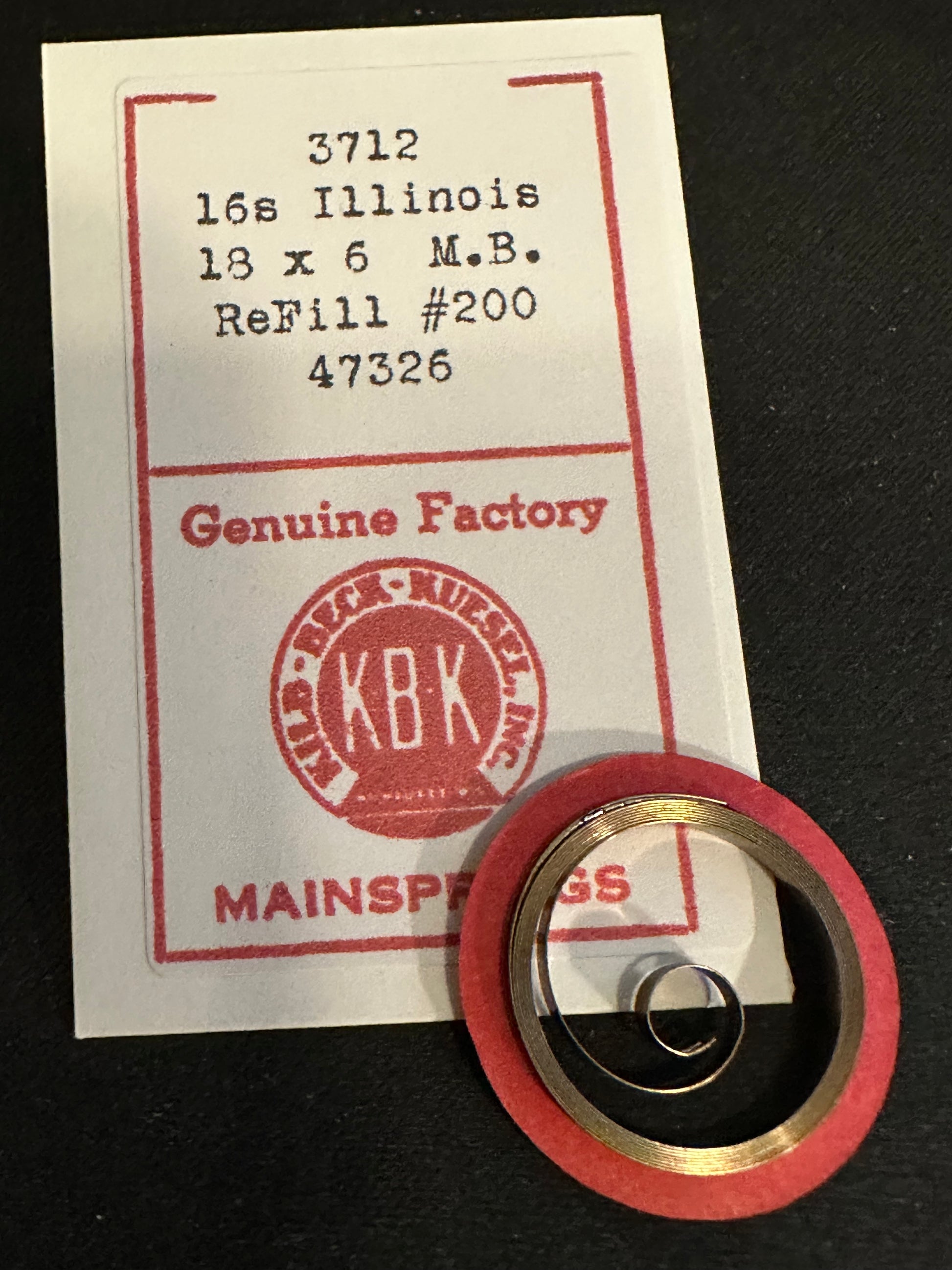 KBK Mainspring #3712 for Illinois 16s movements, Factory No. 47326, steel, new in envelope. See images for precise mainspring specifications. I specialize is hard to find watch parts so I usually have whatever you might need and all watch parts are unconditionally guaranteed. Images do a pretty good job of representing the item.