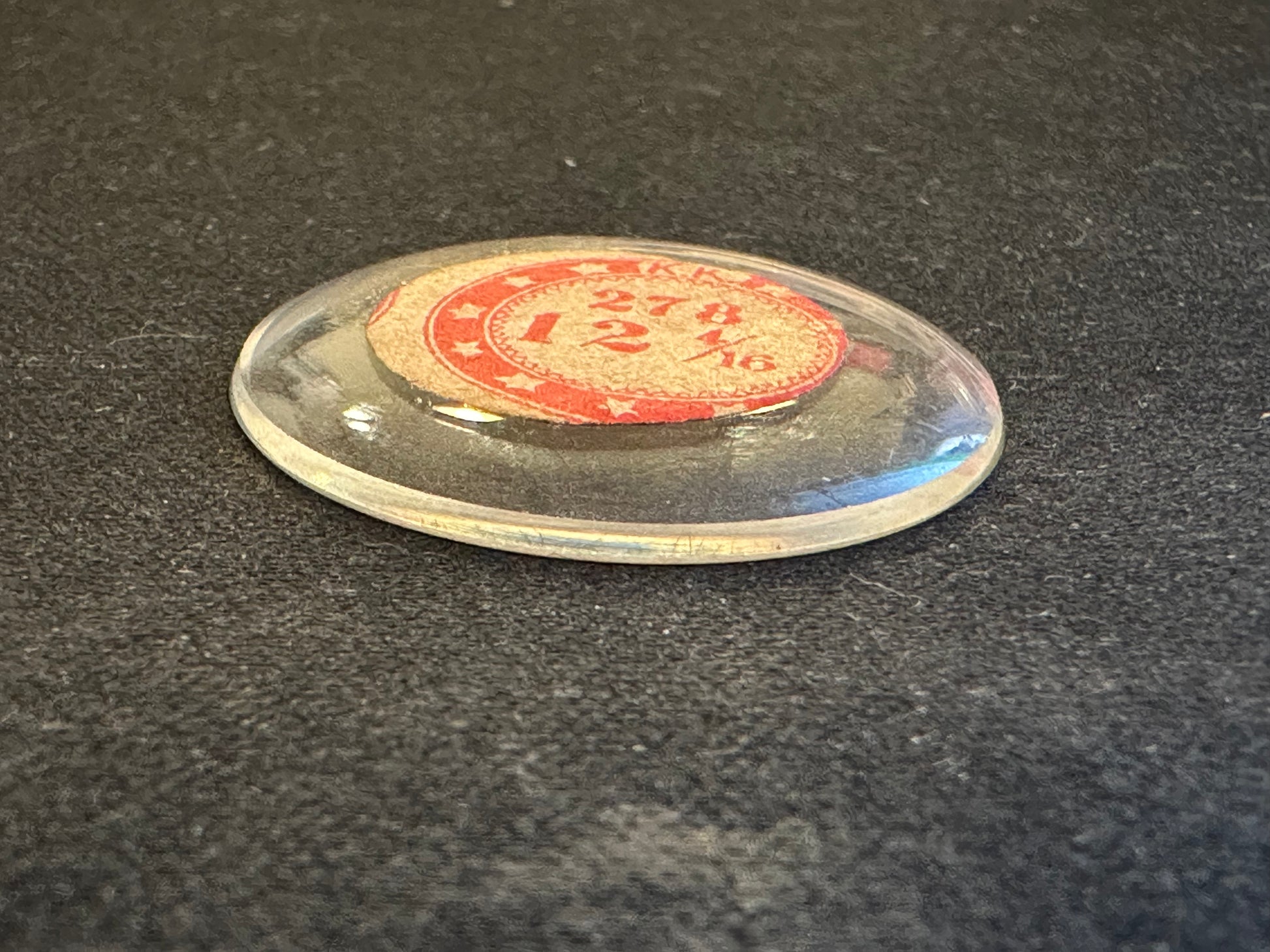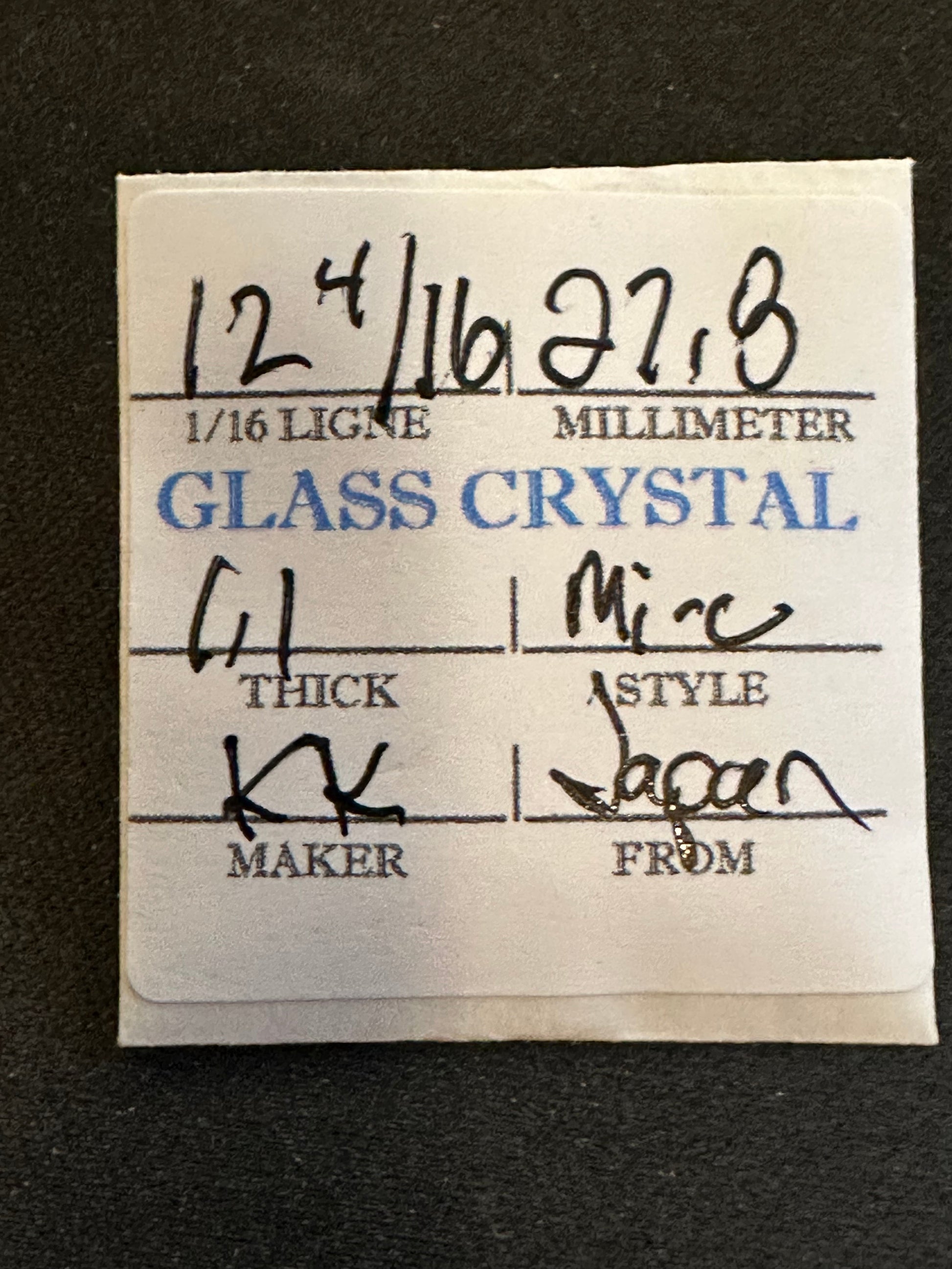 KK Mi-Chevee Vintage Small Glass Pocket Watch Crystal size 12-4/16 = ~27.8mm (marked) with a thickness of ~1.1mm, new old stock. Mi-Chevee is a mid concave shaped crystal suitable for use in most pocket watches, with this one being for smaller watches. These come from glass crystal cabinets that are easily well over 80 years old, so they give real meaning to the term NOS. That said, in my 40 years of experience with them I've not found the older crystals to be any more or less brittle than anything you could find today. I likely have several of these so the one you get may differ slightly from the images. I have a supply of crystals that numbers in the hundreds of thousands so I can usually supply just about any size Watch Crystal you need (glass or acrylic) so feel free to inquire since I can't list them all. Images do an adequate job of representing the item.