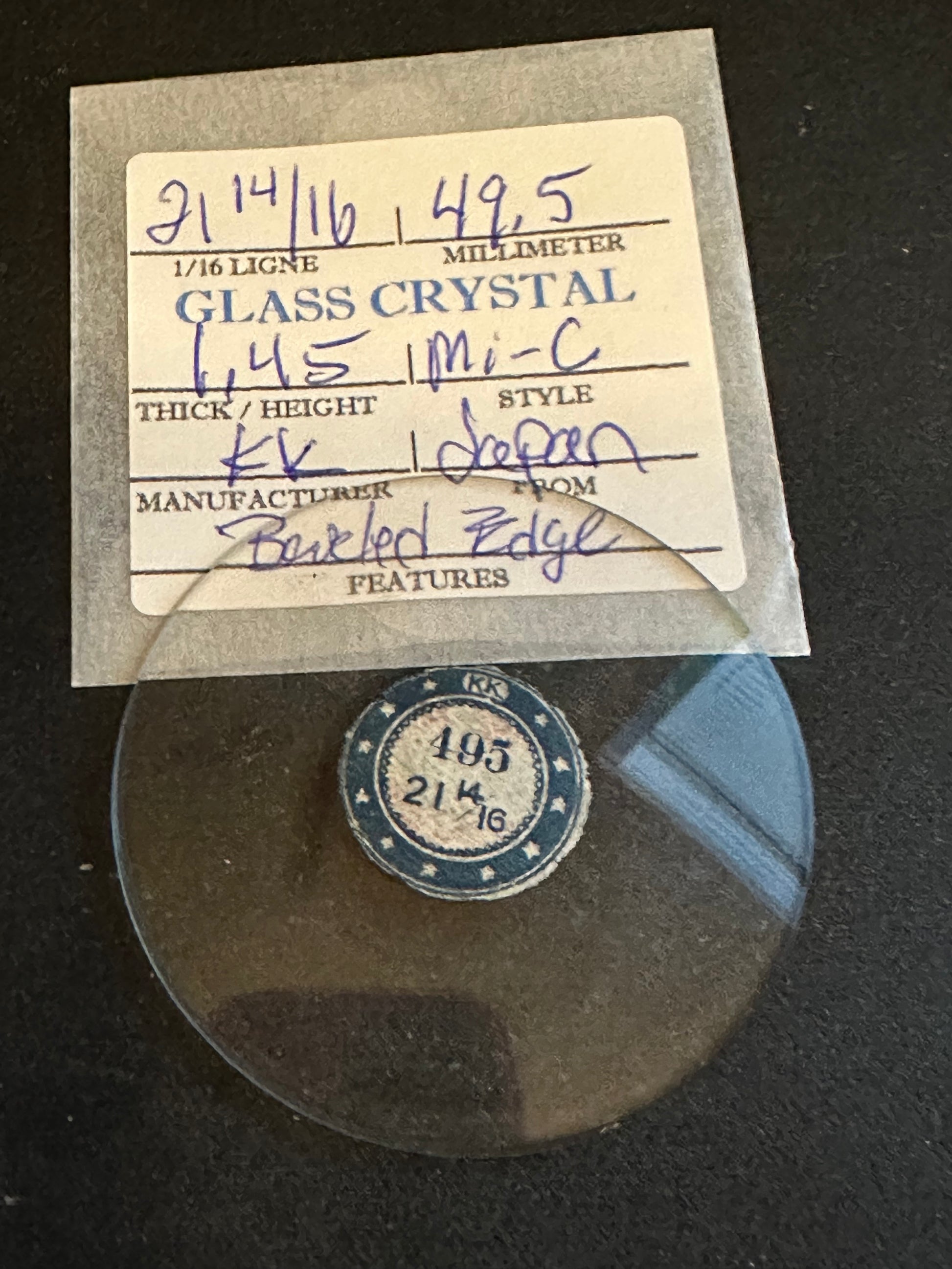 KK Vintage Glass Pocket Watch Crystal size 21-14/16 = ~49.5mm (marked) with a thickness of between 1.2mm and 1.4mm, new old stock. This one has one very small flaw along the rim which will not be visible when the crystal is properly installed - I did try to show it in the pictures. These come from glass crystal cabinets that are easily well over 80 years old, so they give real meaning to the term NOS. That said, in my 40 years of experience with them I've not found the older crystals to be any more or less brittle than anything you could find today. I likely have several of these so the one you get may differ slightly from the images. I have a supply of crystals that numbers in the hundreds of thousands so I can usually supply just about any size Watch Crystal you need (glass or acrylic) so feel free to inquire. Images do an adequate job of representing the item.
