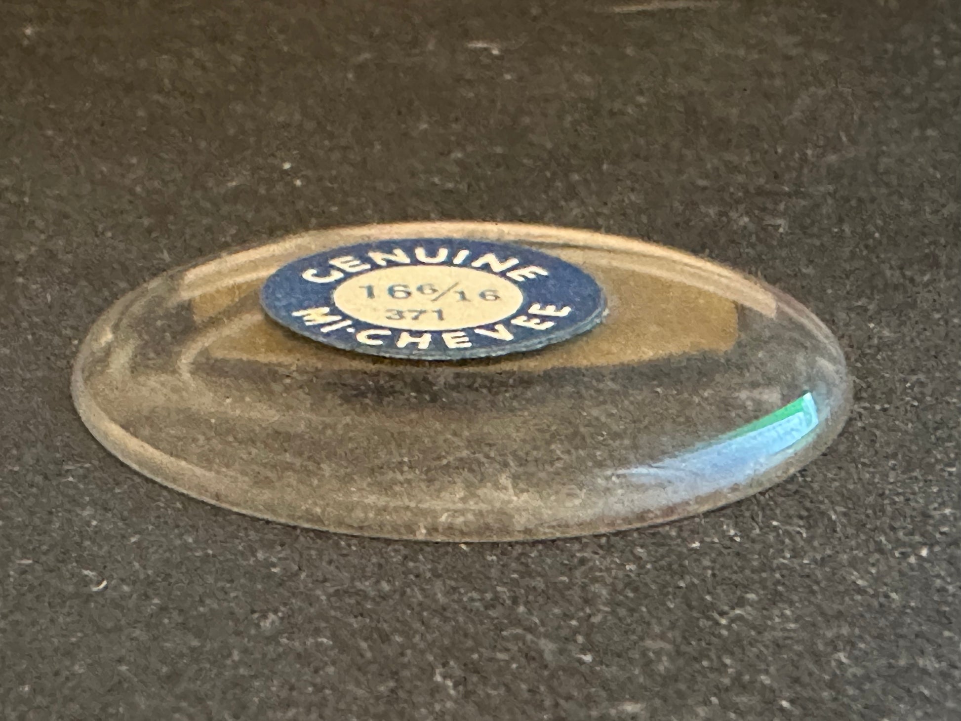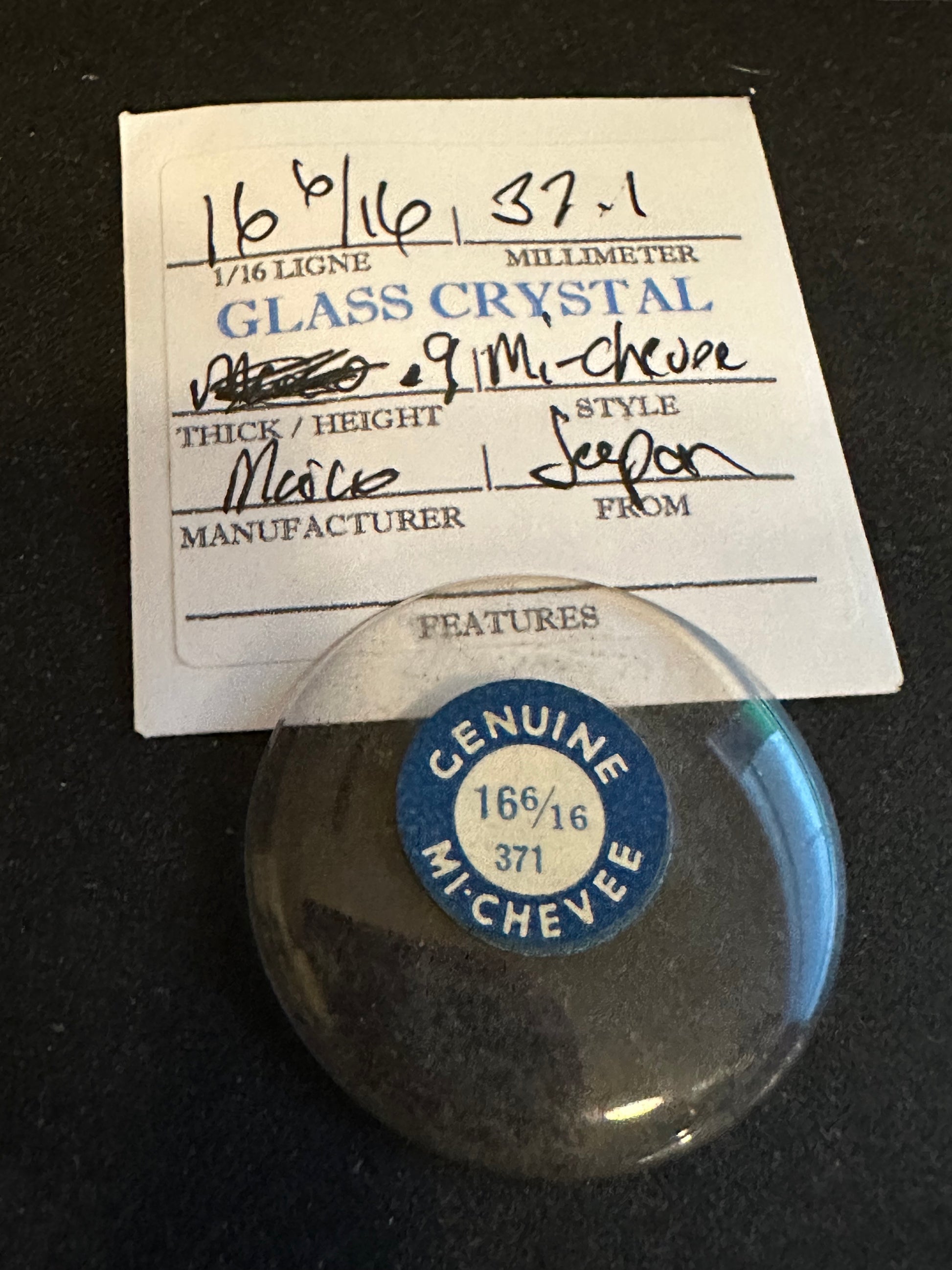 Marco Mi-Chevee Vintage Glass Pocket Watch Crystal size 16-6/16 = ~37.1mm (marked) with a thickness of ~0.9mm, new old stock. Mi-Chevee is a mid concave shaped crystal suitable for use in most pocket watches. These come from glass crystal cabinets that are easily well over 80 years old, so they give real meaning to the term NOS. That said, in my 40 years of experience with them I've not found the older crystals to be any more or less brittle than anything you could find today. I likely have several of these so the one you get may differ slightly from the images. I have a supply of crystals that numbers in the hundreds of thousands so I can usually supply just about any size Watch Crystal you need (glass or acrylic) so feel free to inquire. Images do an adequate job of representing the item.
