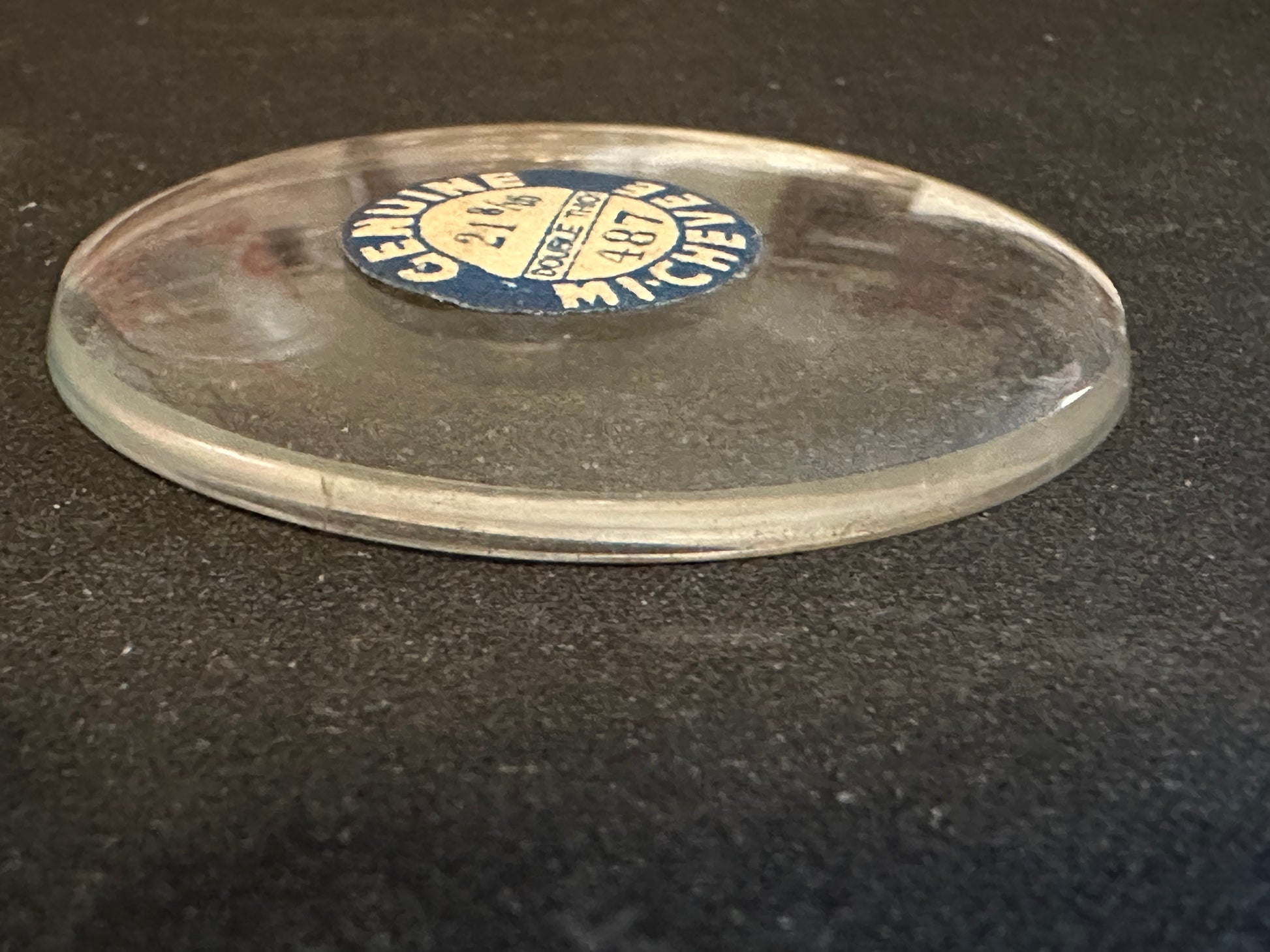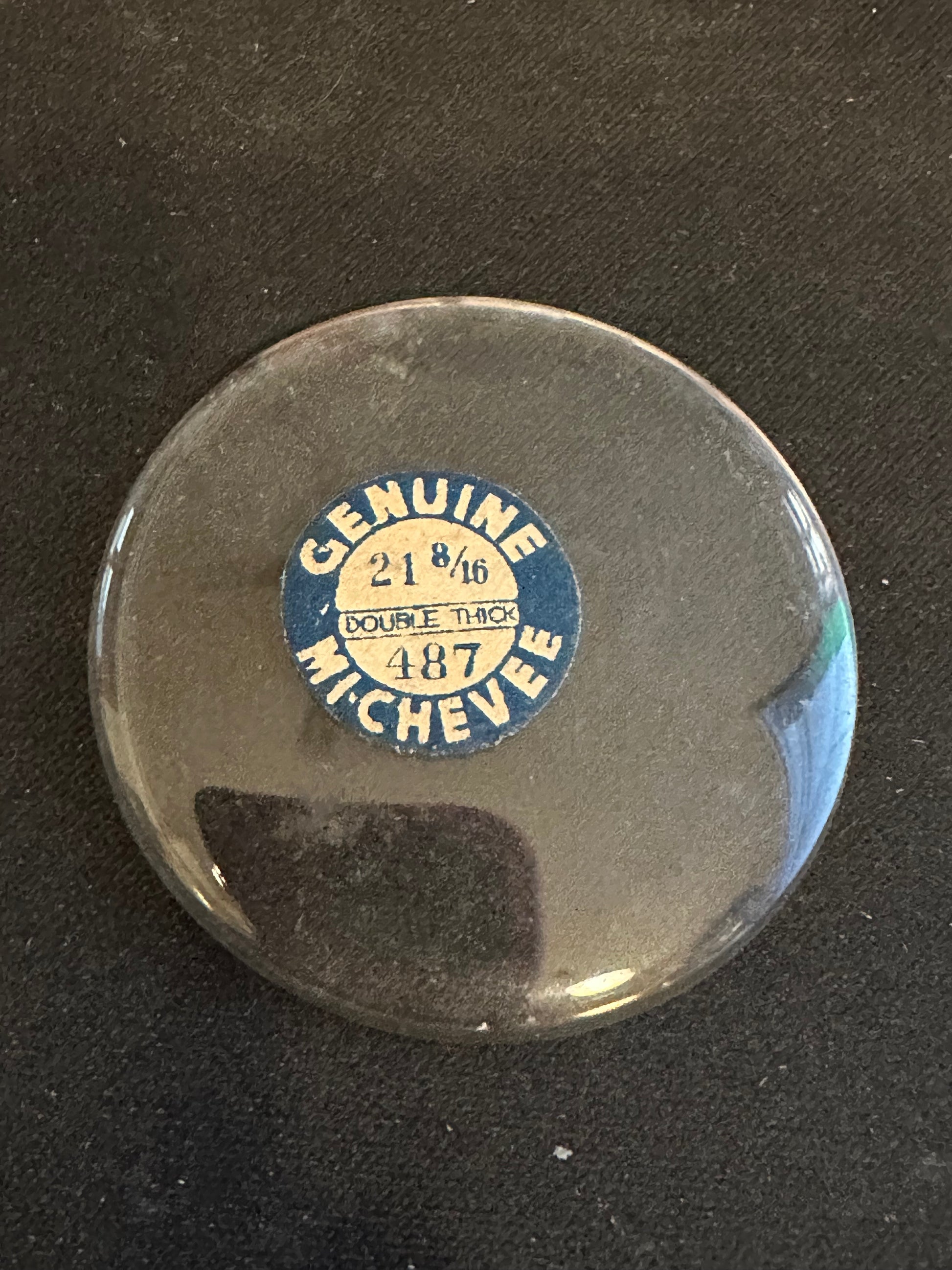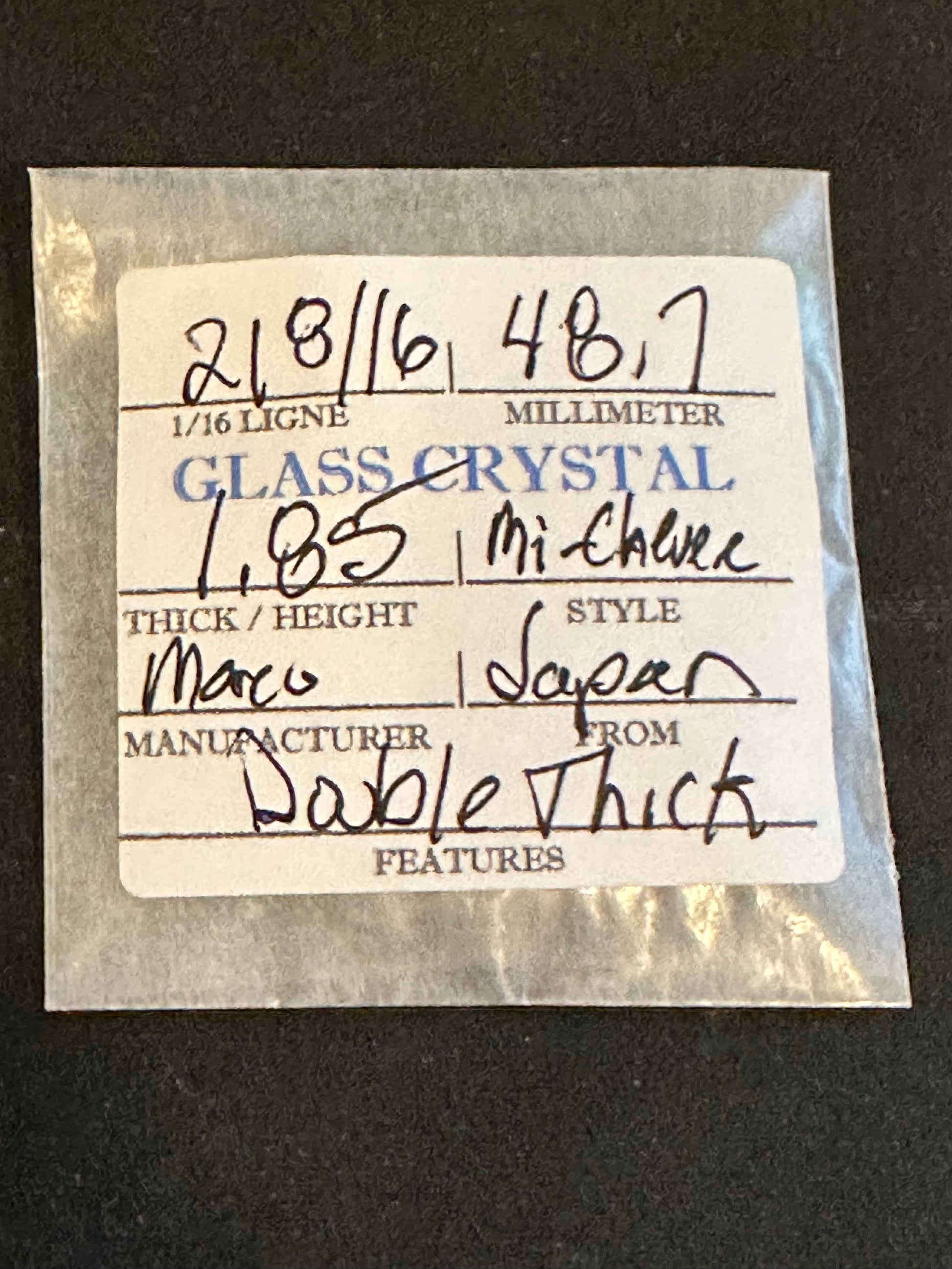 Marco Mi-Chevee DOUBLE THICK Vintage Glass Pocket Watch Crystal size 21-8/16 = ~48.7mm (marked) with a thickness of ~1.85mm which is a really thick crystal for this style, new old stock. Mi-Chevee is a mid concave shaped crystal suitable for use in most pocket watches. This crystal is not pristine as it has a couple of really small nicks but given the uniqueness of the crystal it's well worth using to restore a vintage watch. These come from glass crystal cabinets that are easily well over 80 years old, so they give real meaning to the term NOS. That said, in my 40 years of experience with them I've not found the older crystals to be any more or less brittle than anything you could find today. I likely have several of these so the one you get may differ slightly from the images. I have a supply of crystals that numbers in the hundreds of thousands so I can usually supply just about any size Watch Crystal you need (glass or acrylic) so feel free to inquire. Images do an adequate job of representing the item.