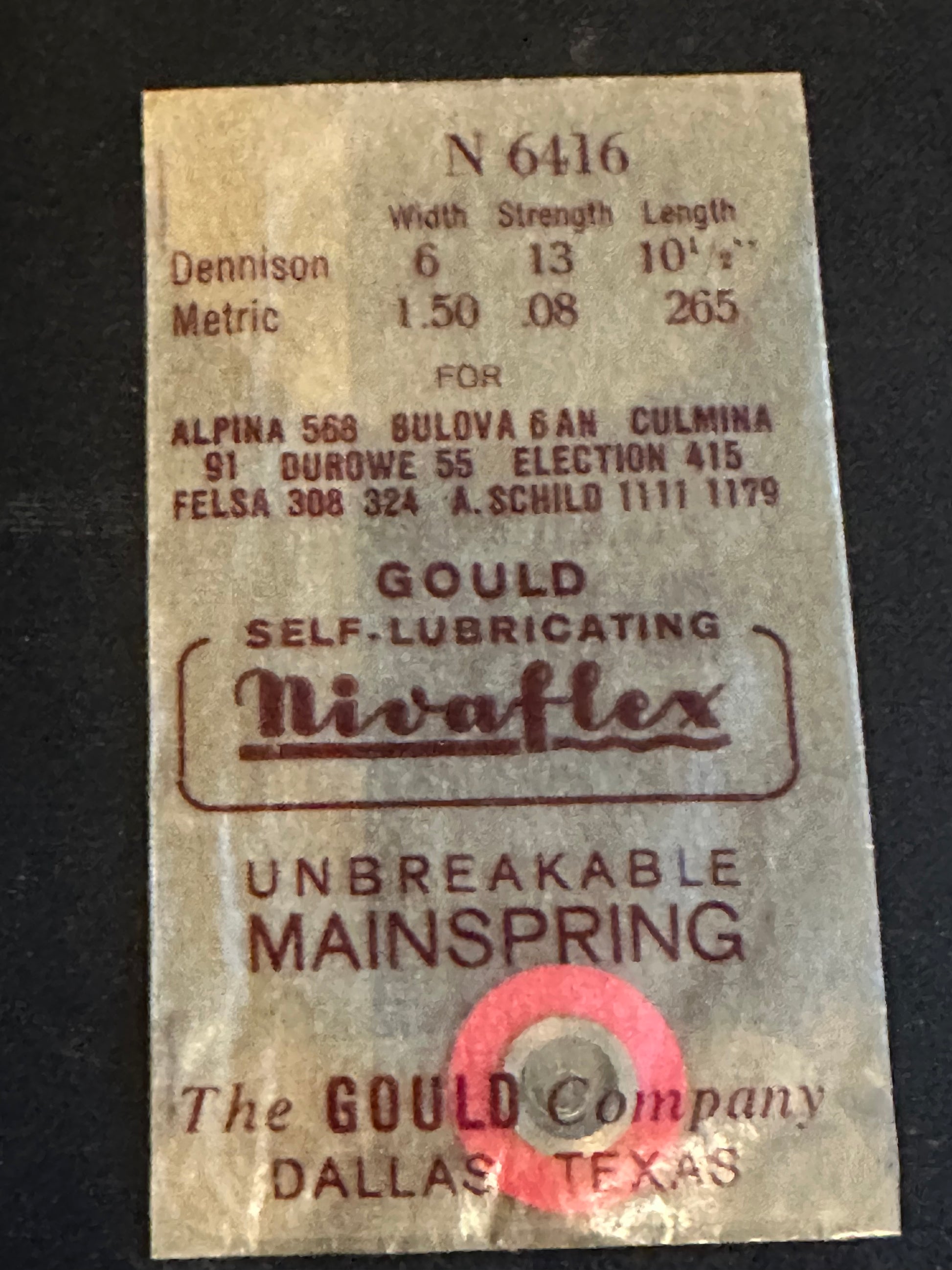 Nivaflex Unbreakable mainspring N 6164 for Alpina 568, Culmina 91, Durowe 55, Felsa 308, 324, Election 415 and even more calibers plus perhaps other similar ébauche movements as well, alloy, new in envelope. See images for all supported calibers and precise mainspring specifications. I specialize in hard to find watch parts so I usually have whatever you might need and all watch parts are unconditionally guaranteed. Images do a pretty good job of representing the item.