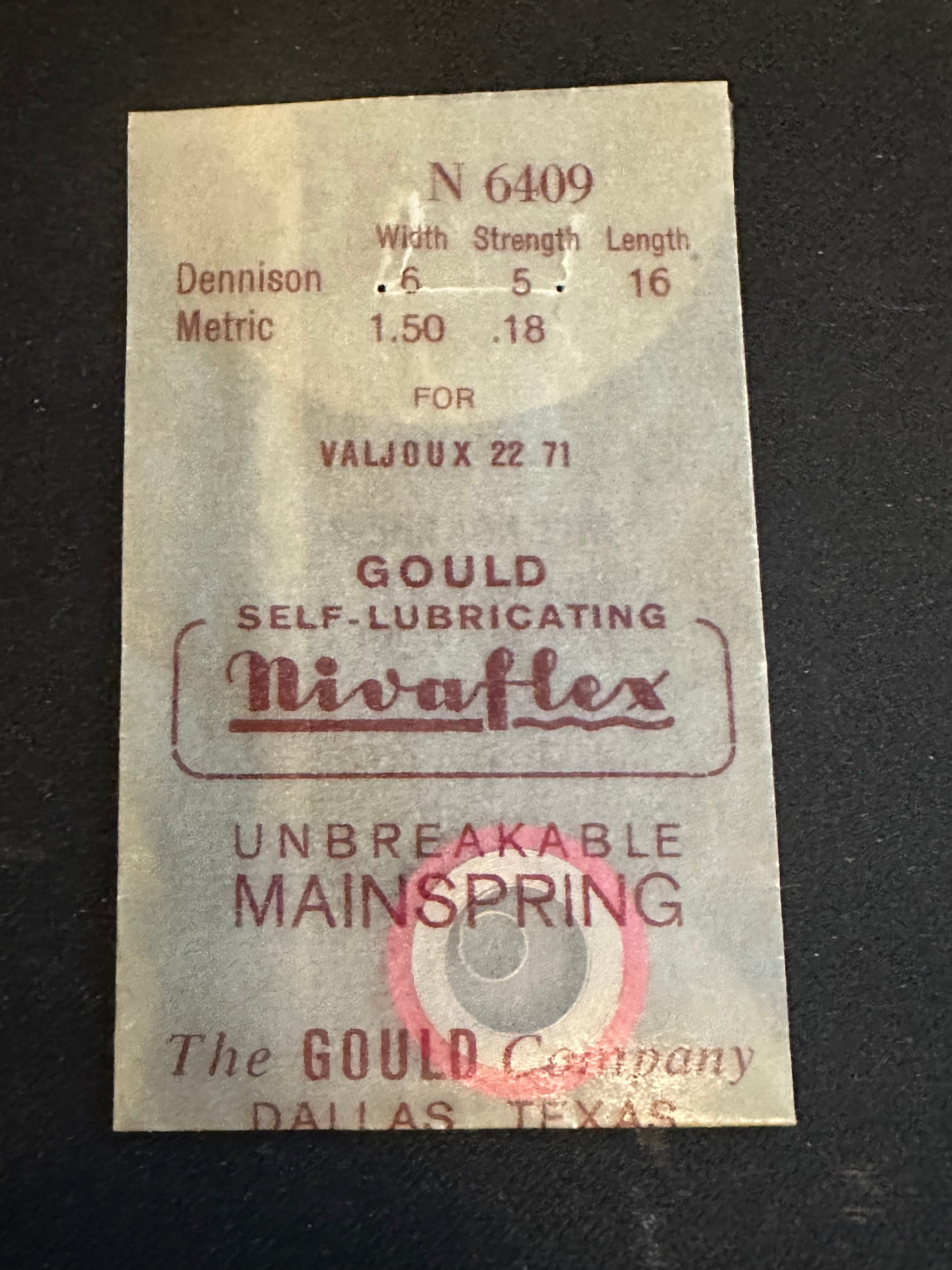 Nivaflex Unbreakable Mainspring N 6409 for Valjoux caliber 22 & 71 Chronograph movements, alloy, new in envelope. See images for further data and precise mainspring specifications. I specialize in hard to find watch parts so I usually have whatever you might need and all watch parts are unconditionally guaranteed. Images do a pretty good job of representing the item.
