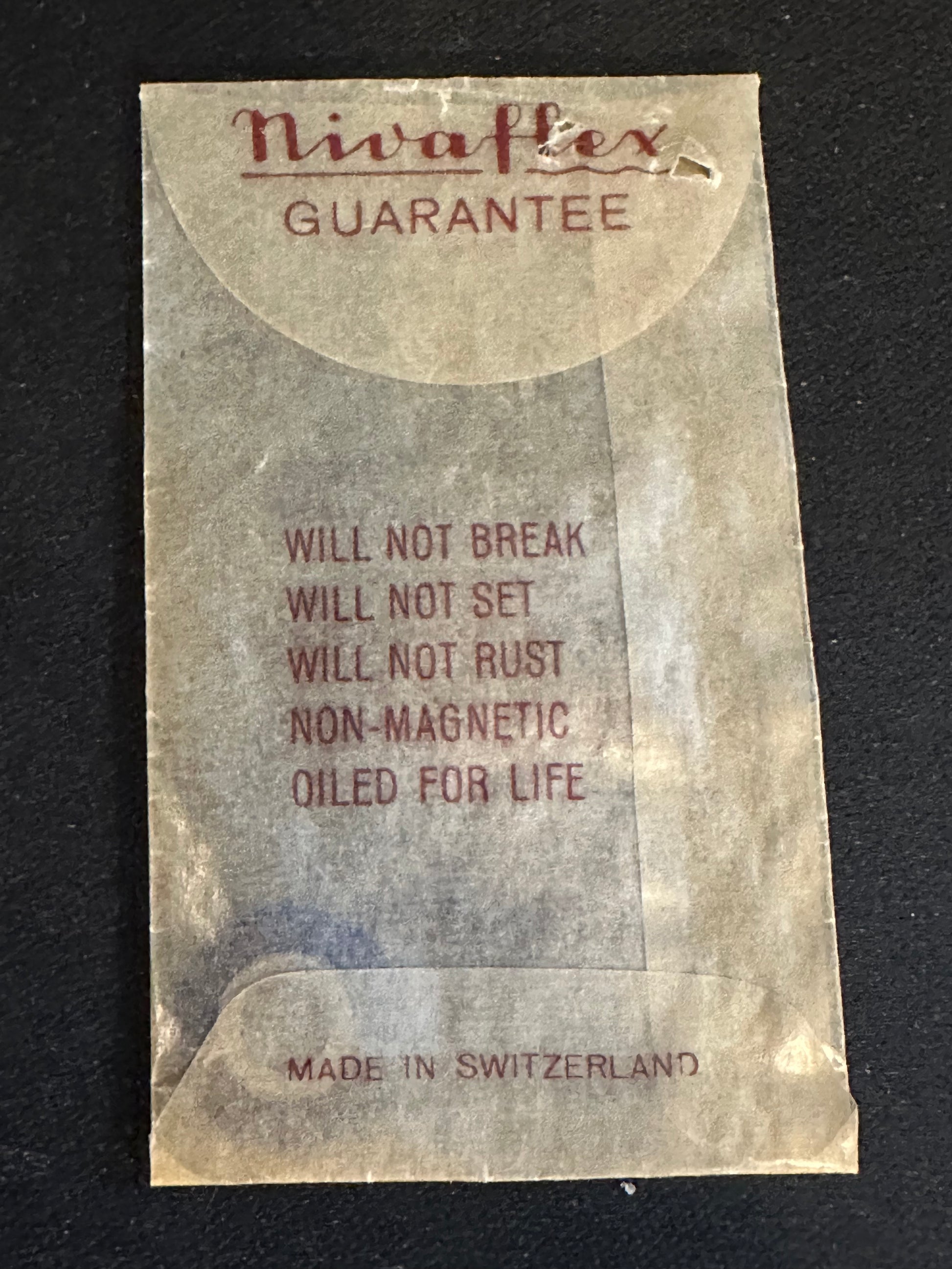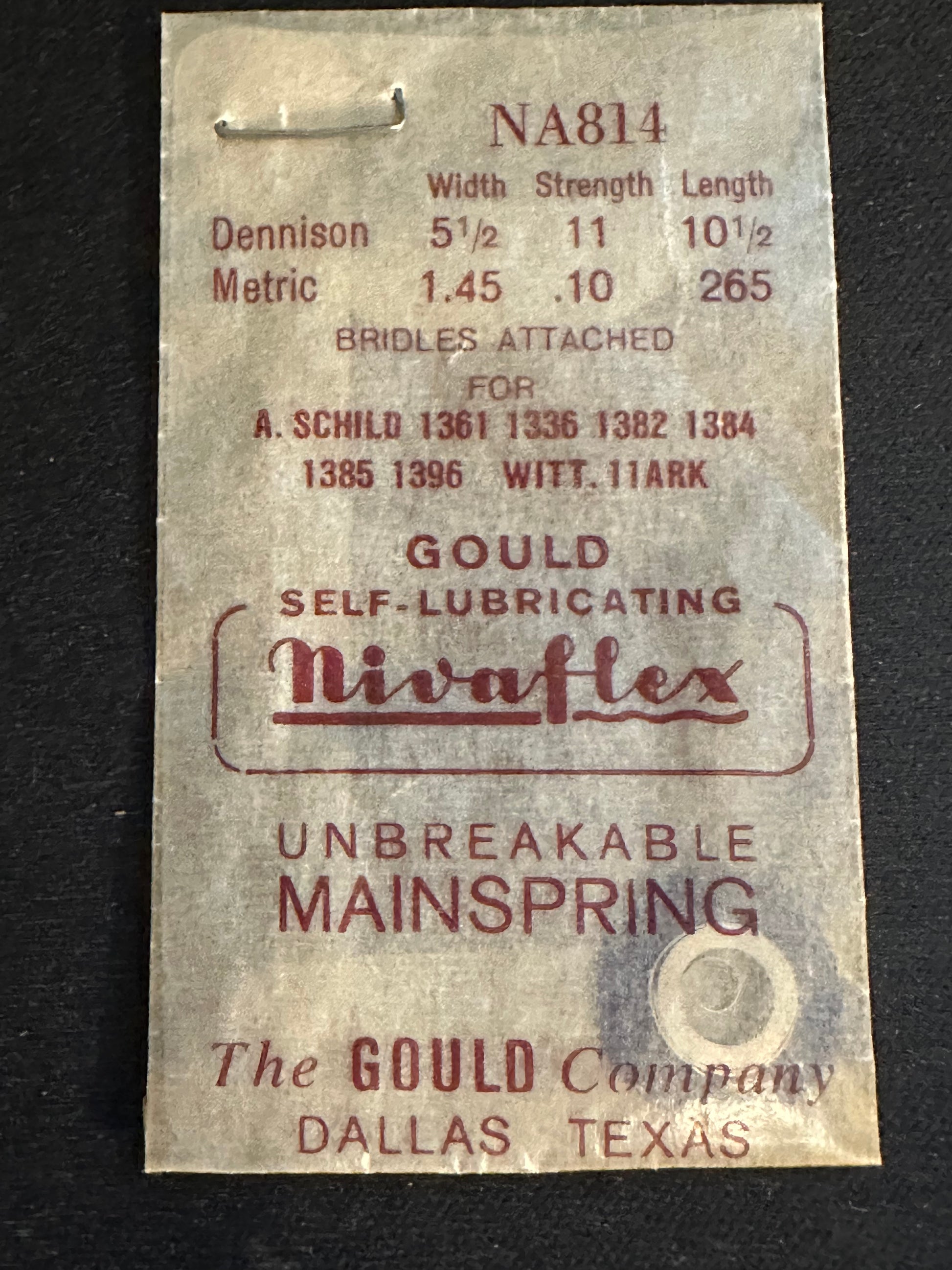 Nivaflex Unbreakable Mainspring NA 814 for AS caliber 1361, 1336, 1382, 1384, 1385, 1386 & Wittnauer caliber 11ARK automatic movements, plus perhaps others as well, white alloy with attached bridle, new in envelope. See image for precise mainspring specifications and further helpful information. I likely have several of these so the one you get may differ slightly from the images. I specialize in hard to find watch parts so I usually have whatever you might need and all watch parts are unconditionally guaranteed. Images do a pretty good job of representing the item.