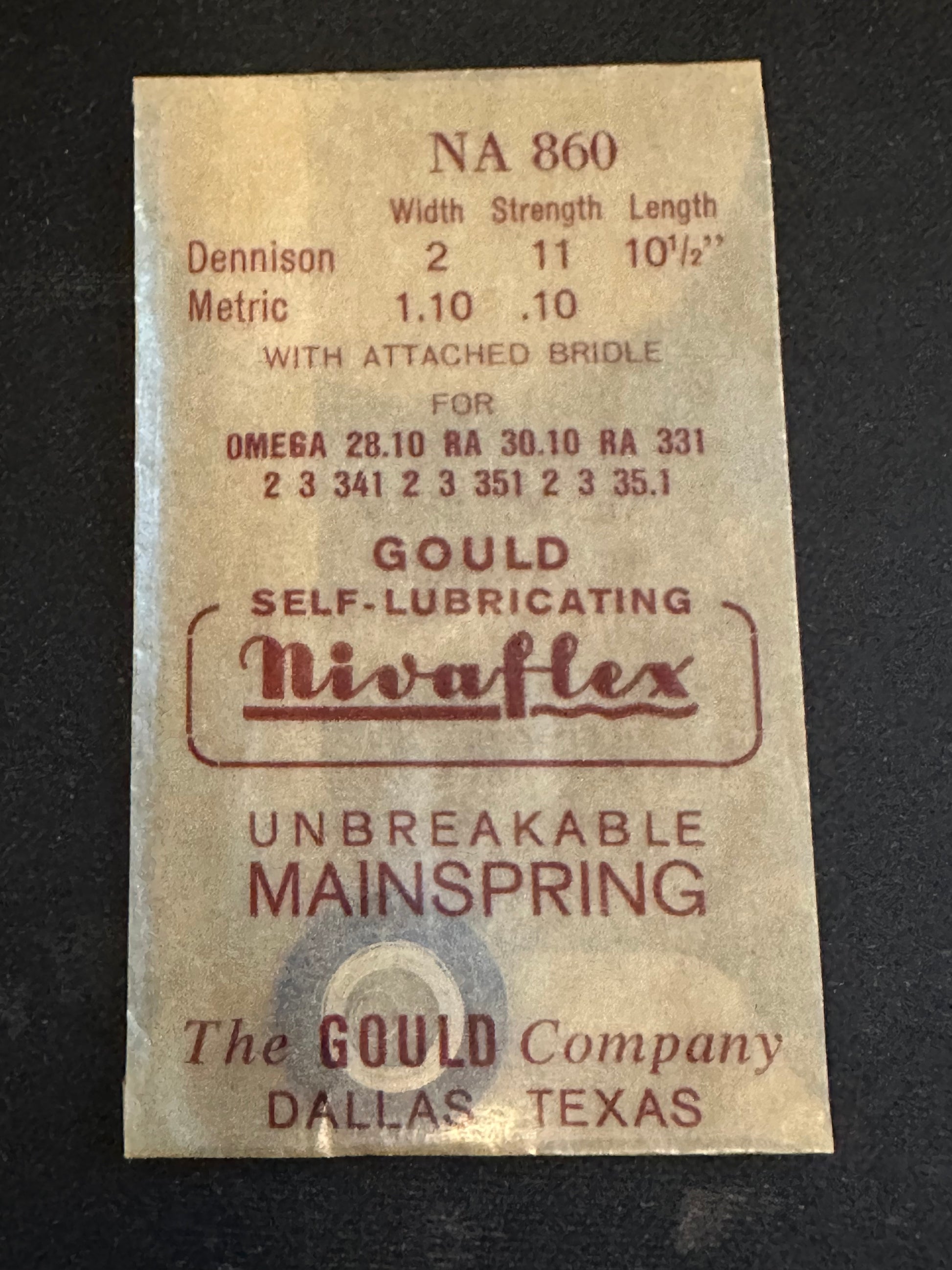 Nivaflex Unbreakable Mainspring NA 860 for Omega caliber 28.10 RA, 30.10 RA, 331, 332, 333, 341, 342, 343, 351, 352, 353, 35.1 automatic movements, plus perhaps several other Omega calibers, white alloy with attached bridle, new in envelope. See image for precise mainspring specifications and further helpful information. I specialize in hard to find watch parts so I usually have whatever you might need and all watch parts are unconditionally guaranteed. Images do a pretty good job of representing the item.