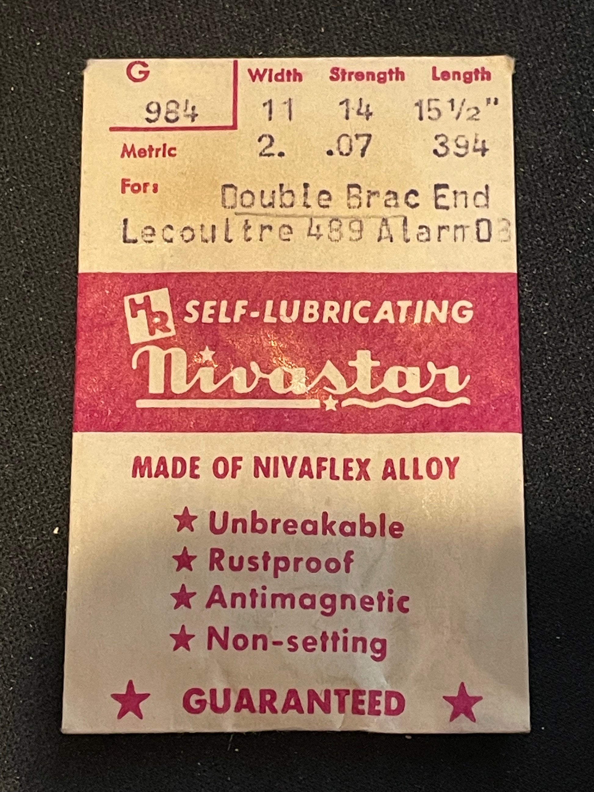 Nivastar Mainspring G984 for LeCoultre caliber 489 Wrist Alarm (Memovox) ALARM side, white alloy, new in envelope. See images for precise mainspring specifications. I likely have several of these so the one you get may differ slightly from the images. I specialize in hard to find watch parts so I usually have whatever you might need and all watch parts are unconditionally guaranteed. Images do a pretty good job of representing the item.