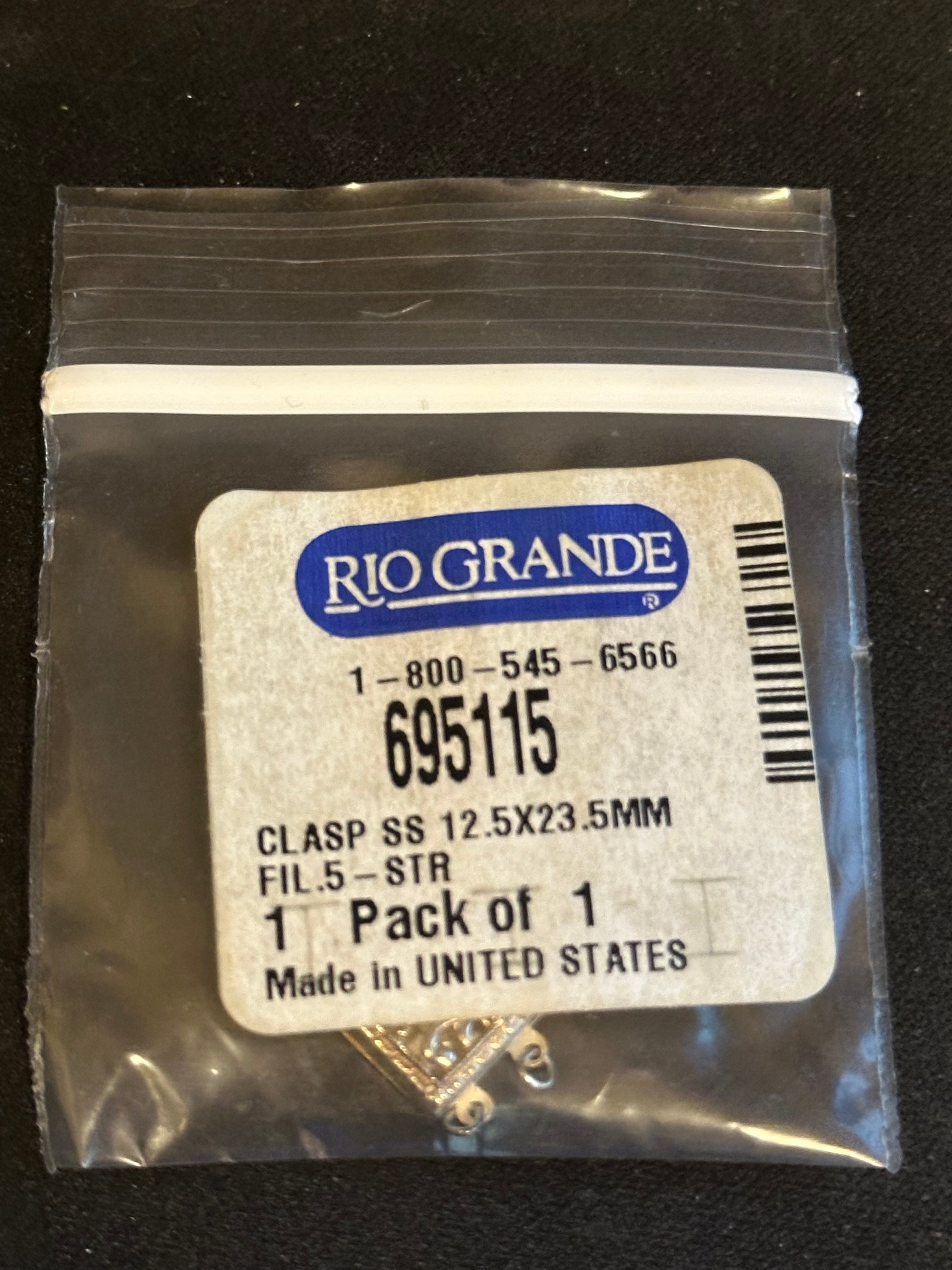 One Sterling Silver 23.5 x 12.5mm Filigree Box Safety Clasp, 5-Strand, orignally from Rio Grande as P/N 695115, new in bag. The description Rio Grande uses is filigree but the pattern resembles a flower to me. Images do a suitable job of representing the item.