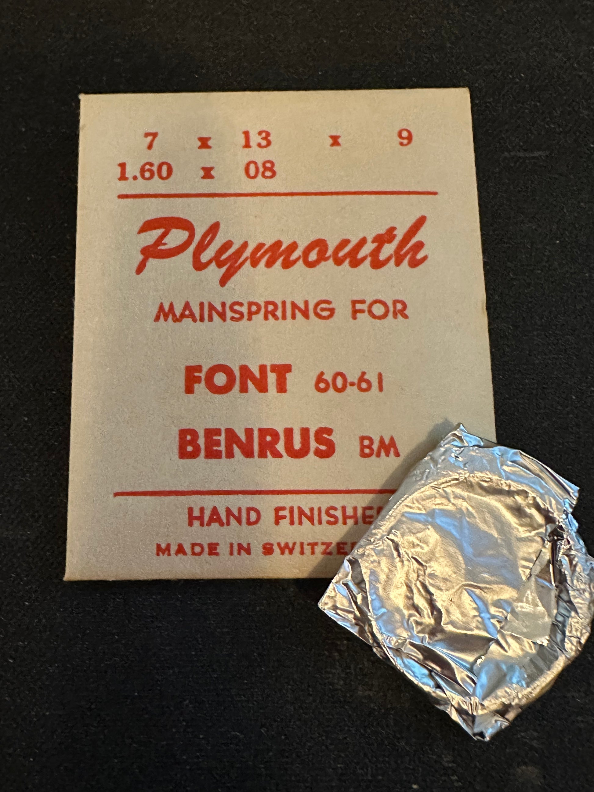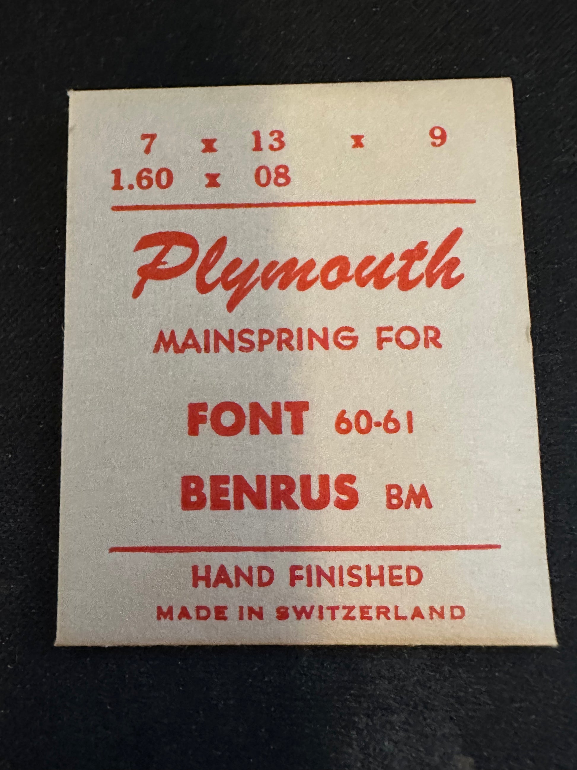 Plymouth mainspring for Font caliber 60, 61 & Benrus caliber BM movements plus perhaps others as well, steel, new in envelope. See images for further data and precise mainspring specifications. I specialize in hard to find watch parts so I usually have whatever you might need and all watch parts are unconditionally guaranteed. Images do a pretty good job of representing the item.