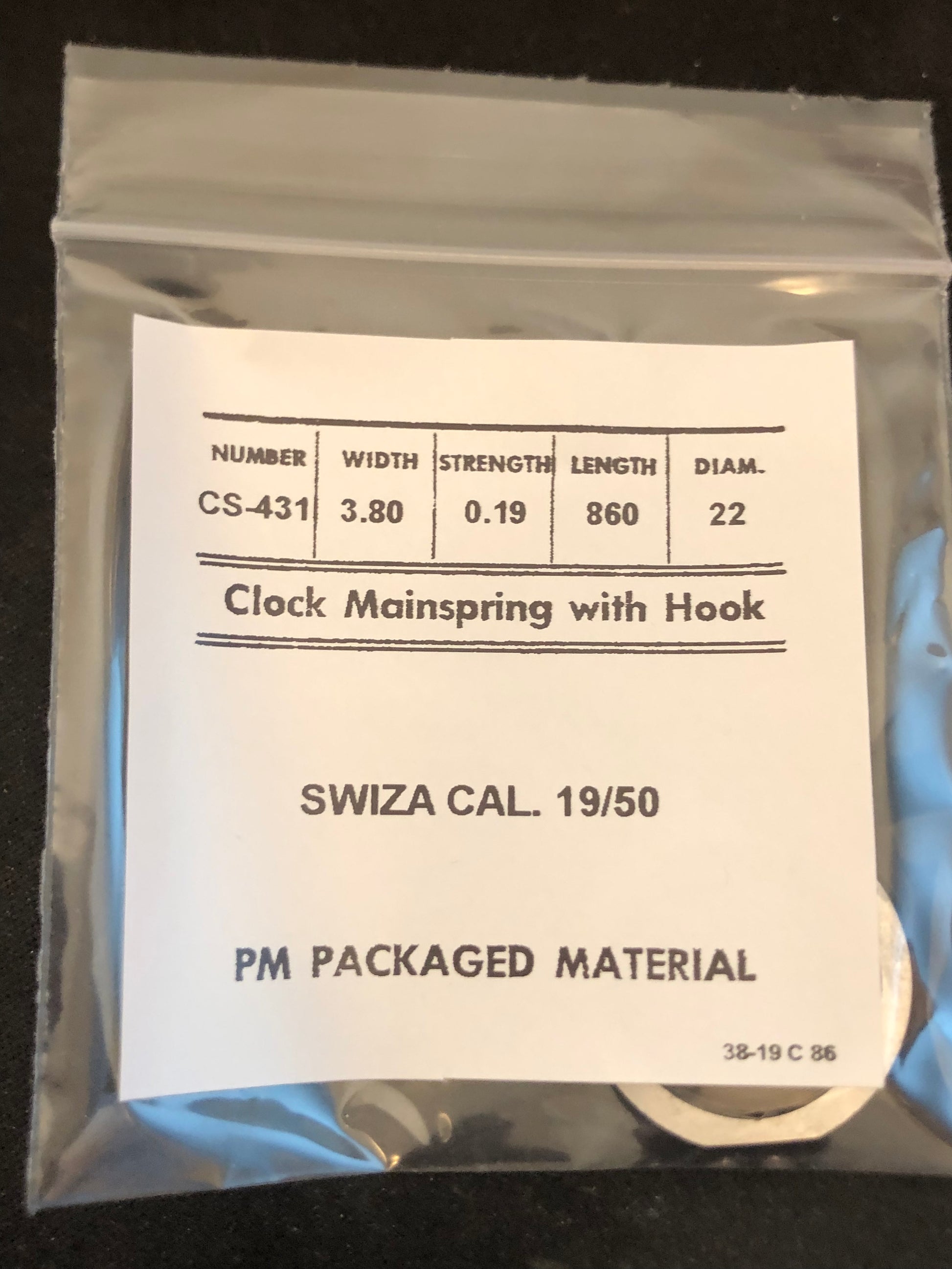 PM Packaged Material TIME side Mainspring for SWIZA caliber 19/50 Alarm and Travel Clocks from the 1930's and beyond, PM P/N CS-431, GR Ref 38-19 C 86, regular tongue-End, steel, new in packaging. Could also very well fit in other Travel & Alarm clocks - pretty sure it fits caliber 56 and it looks like it's a pretty close match for many others. See images for precise mainspring specifications. I likely have several of these so the one you get may differ slightly from the images. I specialize in hard to find parts so I usually have whatever you might need and all parts are unconditionally guaranteed. Images do a pretty good job of representing the item.