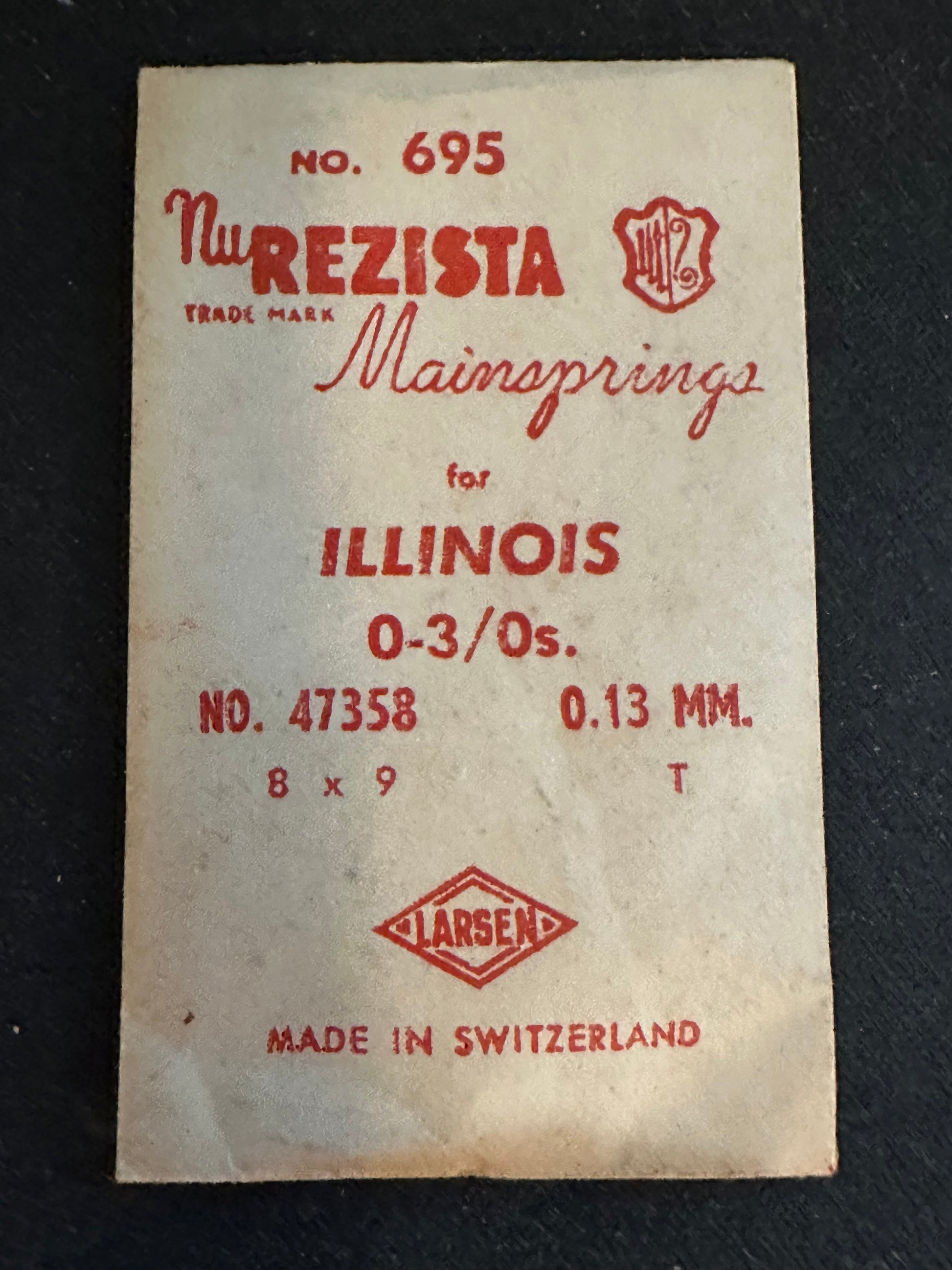 NuResista Mainspring No. 695 for Illinois 0s & 3/0s movements, Factory No. 47358 steel, new in envelope. See images for further details. I specialize is hard to find watch parts and all watch parts are unconditionally guaranteed. Images do a pretty good job of representing the item.