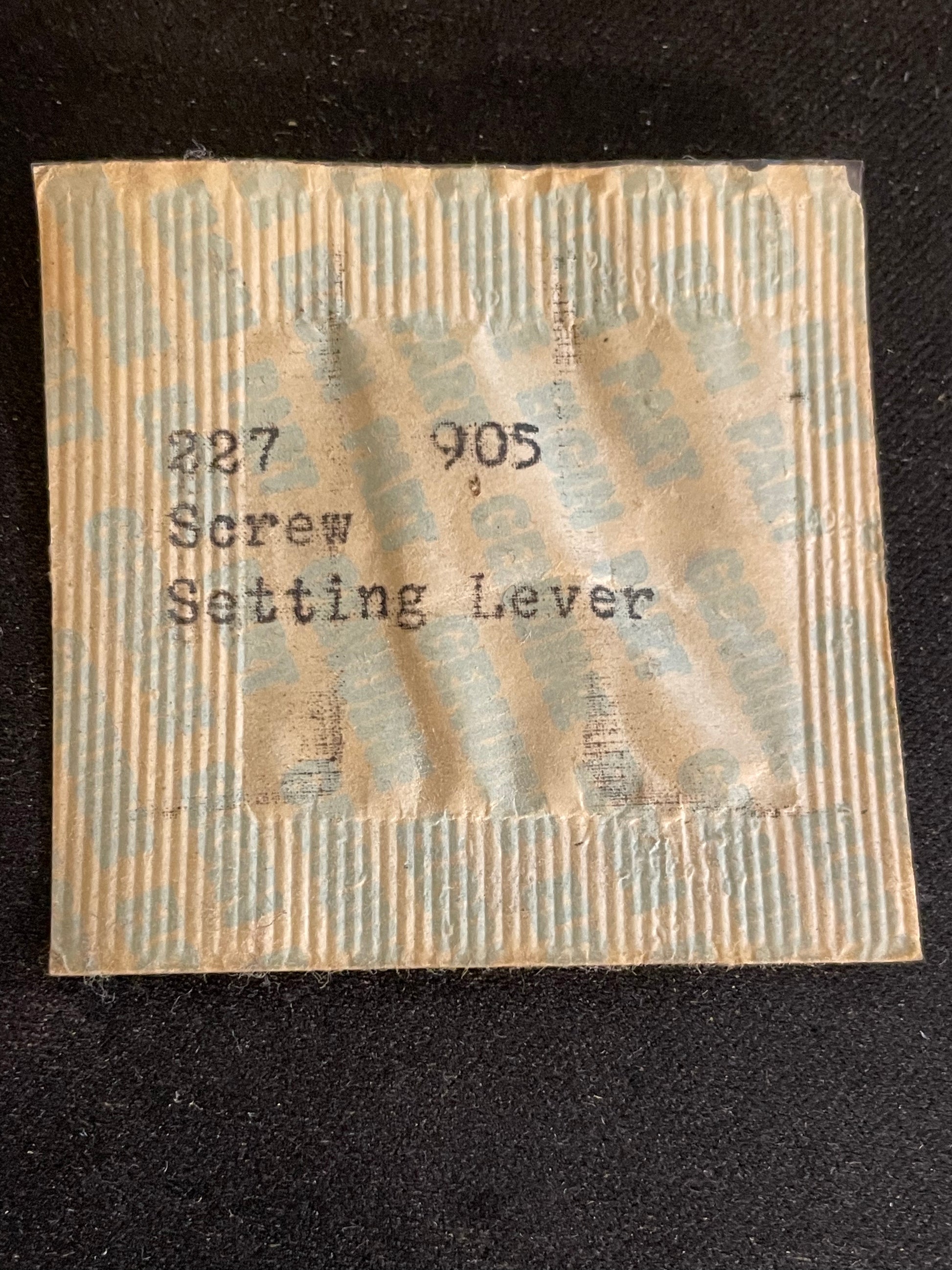 Elgin Factory Setting Lever Screw for 20/0s (and perhaps 21/0s) Grade 905, 906, 907 movements, Catalog No. 207-905, new in package. I specialize is hard to find watch parts so I usually have whatever you might need and all watch parts are unconditionally guaranteed. Images are of the actual item and do a suitable job of representing it.