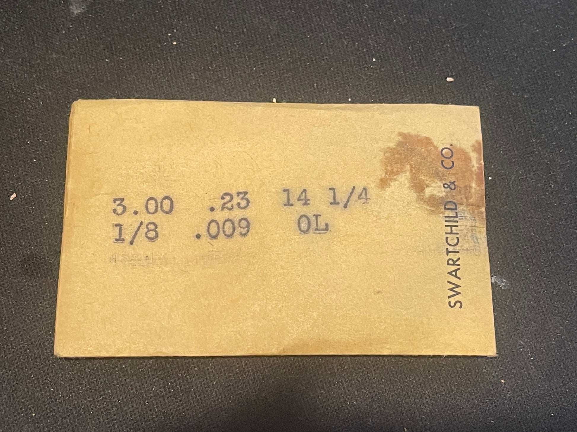 Swartchild & Co Clock Mainspring, OPEN LOOP End, Dennison 1/8 x .009 x 14¼, from the 1950's, steel, made in France. Suitable for H.A.U. 79, Junghans 79. See images for precise mainspring characteristics. The stain on the envelope is leftover tape sticky-goo. I specialize is hard to find watch & clock parts and all parts are unconditionally guaranteed. Images do a pretty good job of representing the item