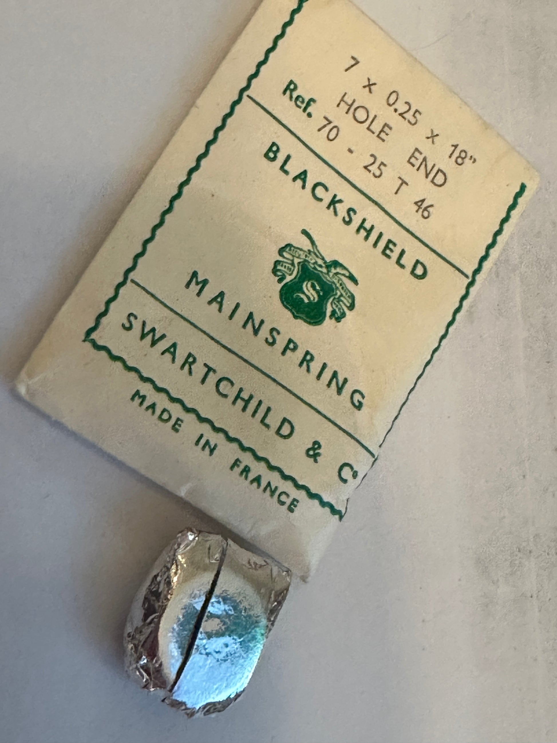 Swartchild & Co Black Shield Clock Mainspring, HOLE End, 7.0 x 0.25 x 10”, GR Ref. 70-25 T 46, steel, new in envelope. I likely have several of these so the exact packaging may be different. I specialize is hard to find watch & clock parts and all parts are unconditionally guaranteed. Images do a pretty good job of representing the item