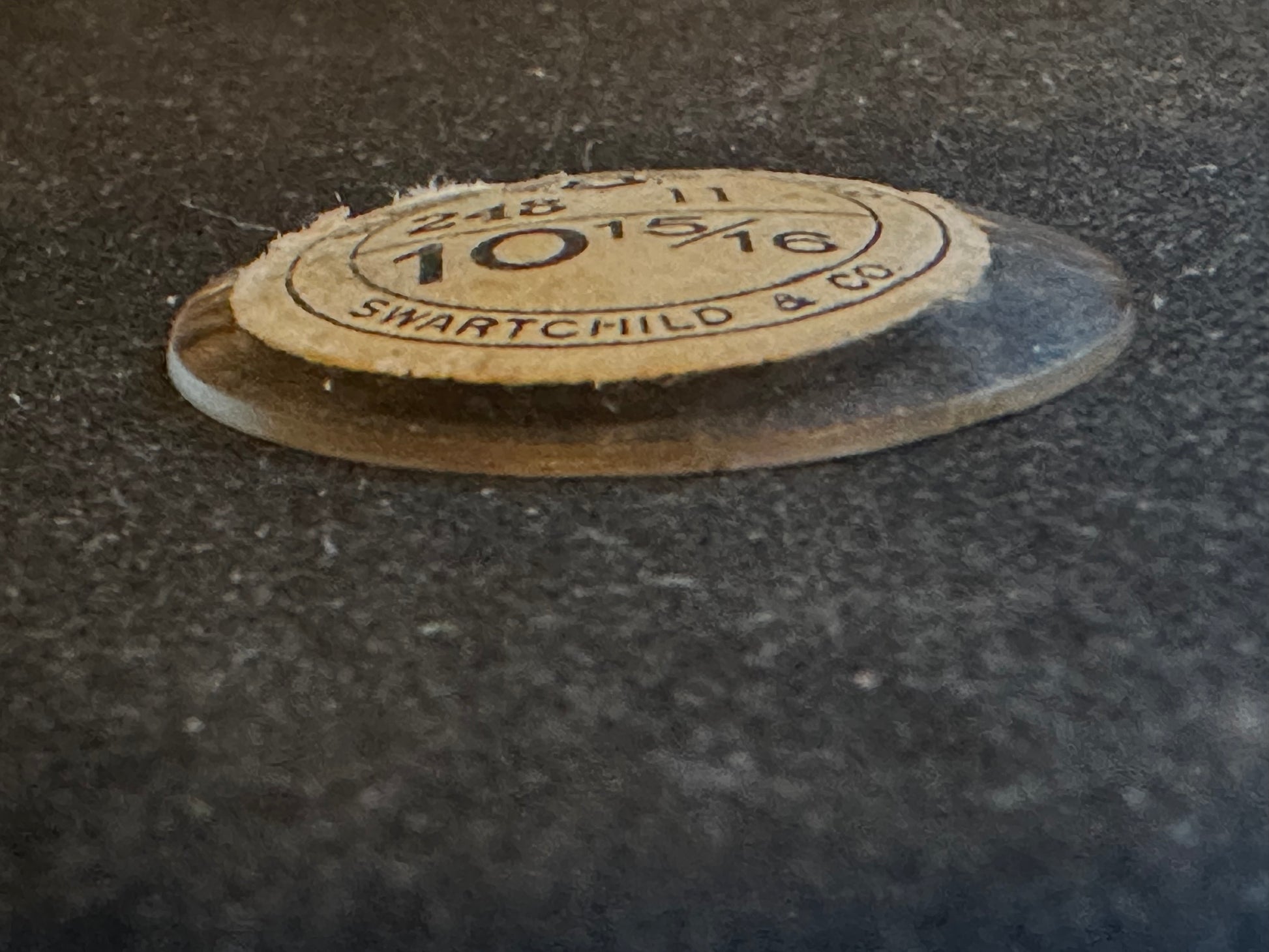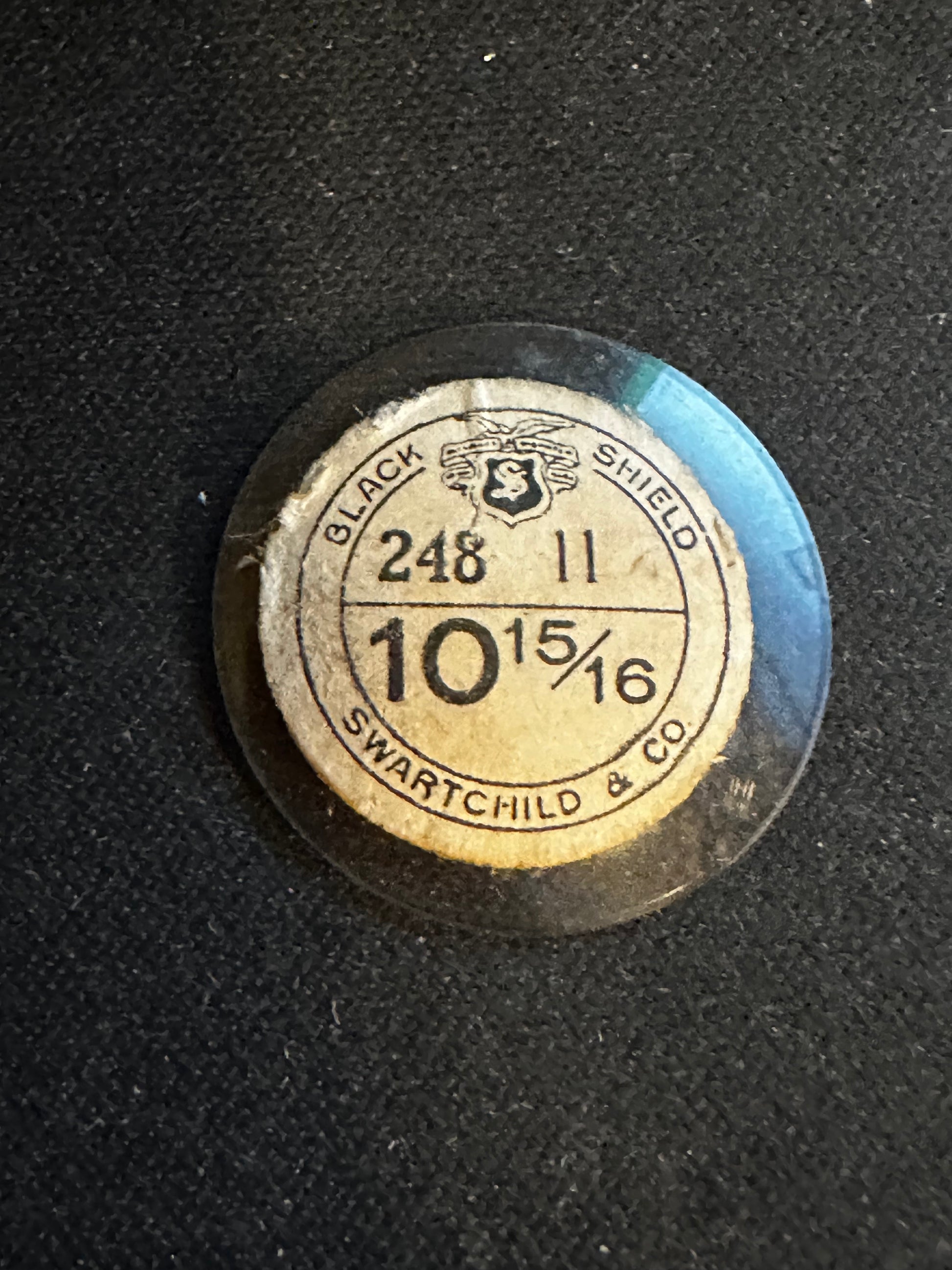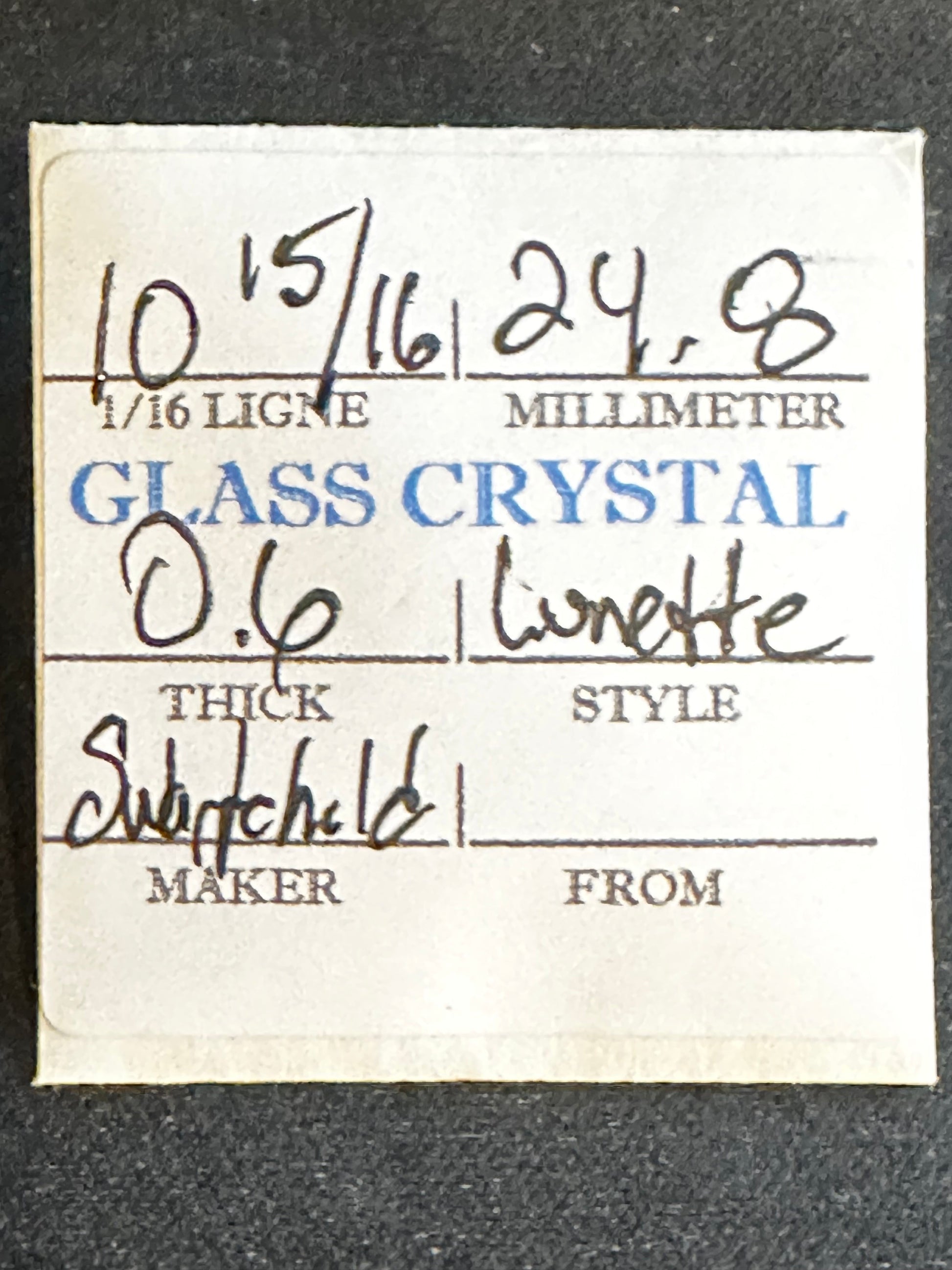 Swartchild Vintage Glass Pendant Watch Crystal size 10-15/16 = ~24.8mm (marked) with a thickness of ~0.6mm. Swartchild usually marked their glass crystal with two numbers presumably to address the size variation common in glass crystals, hence the 1/16 difference between the two. This Lunette profile crystal that provides a somewhat higher dome than concave. While still likely over 100 years old, in my 40 years of experience with them I've not found the older crystals to be any more or less brittle than anything you could find today. That said, they are quite likely dirty and need serious cleaning. I have a supply of crystals that numbers in the hundreds of thousands so I can usually supply just about any size Watch Crystal you need (glass or acrylic) so feel free to inquire. Images do an adequate job of representing the item.