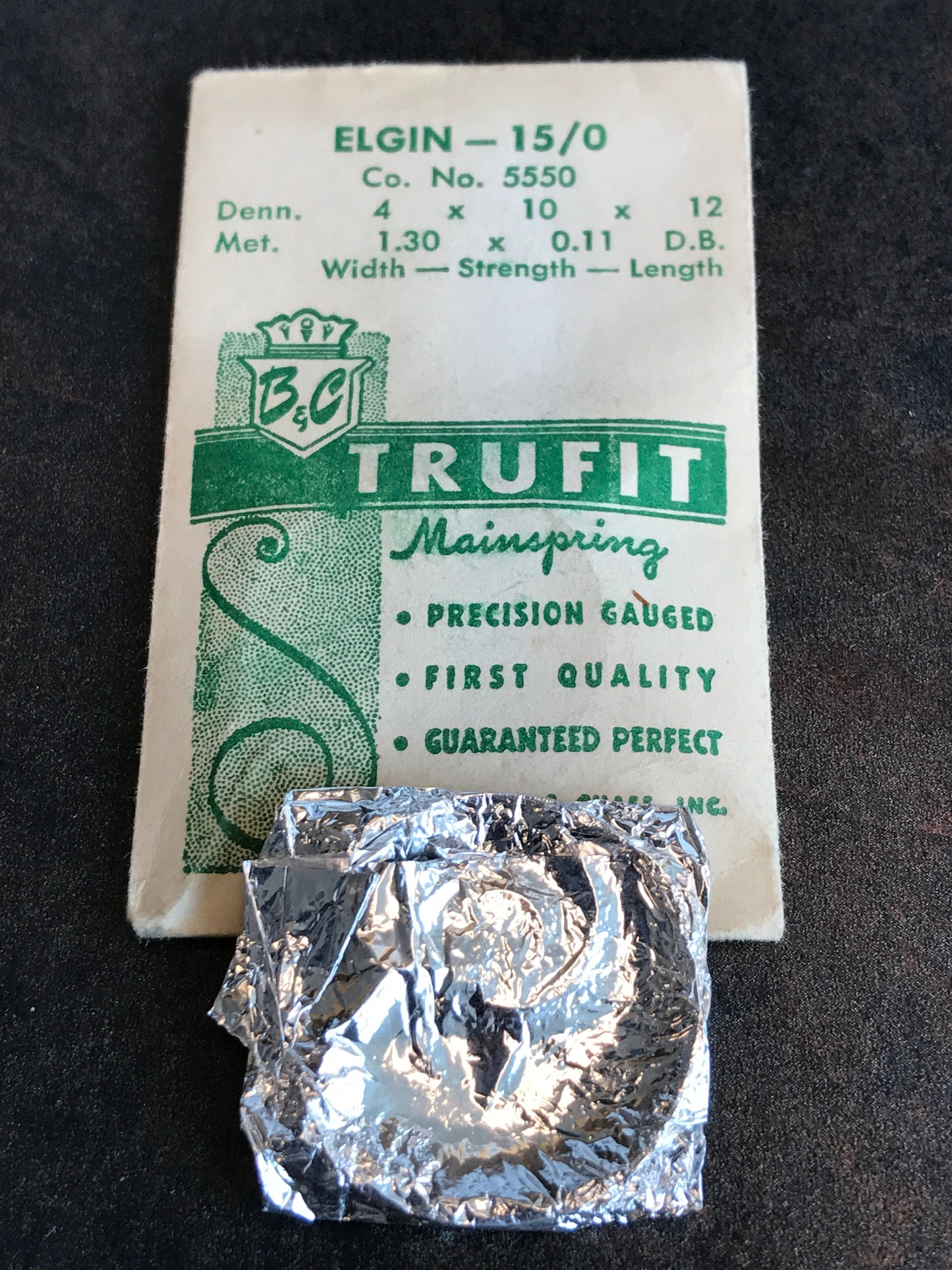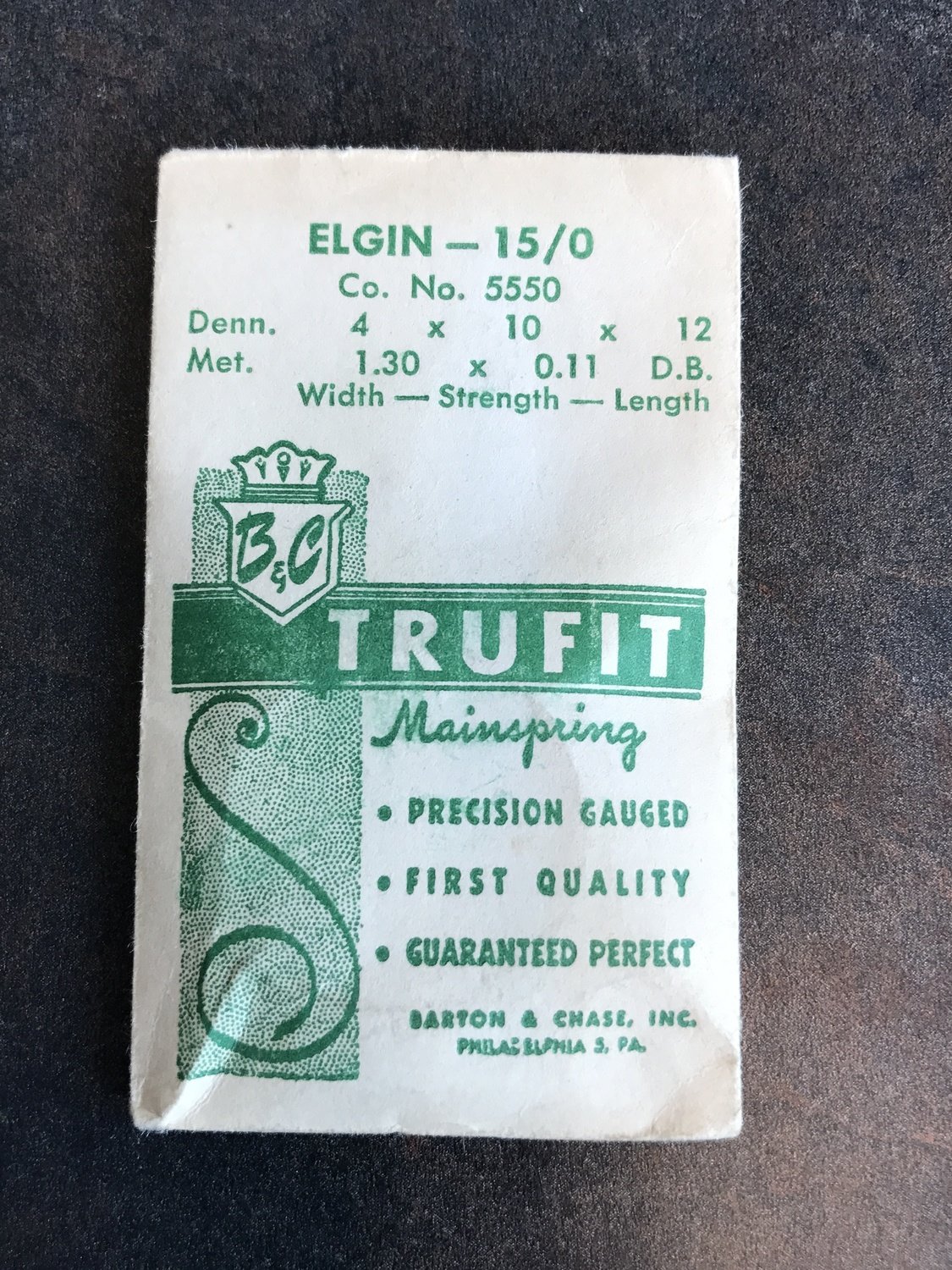 Trufit Mainspring for Elgin 15/0s movements, Factory No. 5550, steel, new in envelope. 15/0s are usually grades 536, 537, 538, 557, 558, 559, 623, 624 & 626. B&C Trufit mainsprings were distributed by Barton & Chase of Philadelphia but I'm pretty sure they are made in Switzerland. See image for precise characteristics. I specialize in hard to find watch parts and all watch parts are unconditionally guaranteed. Images do a pretty good job of representing the item.
