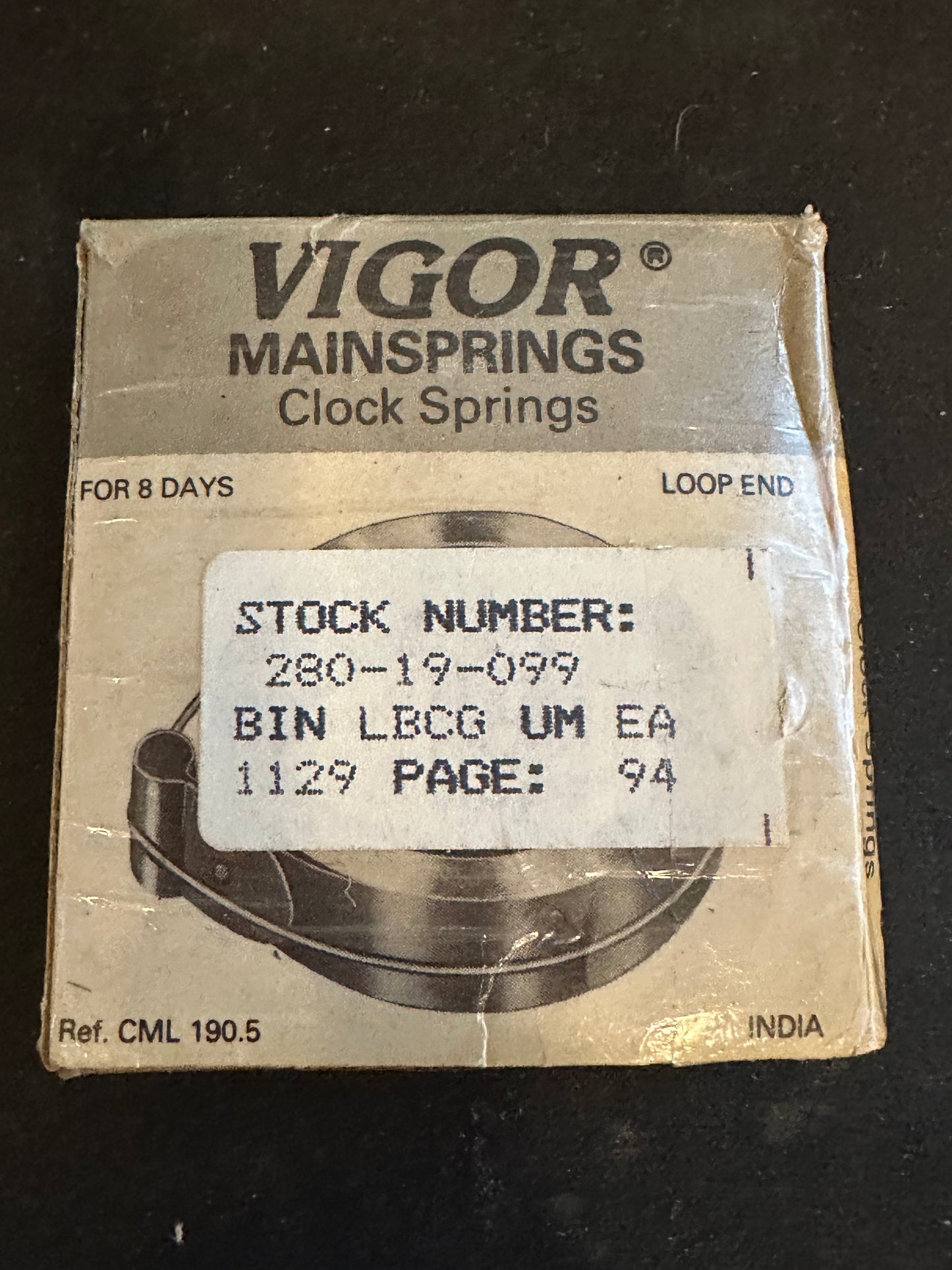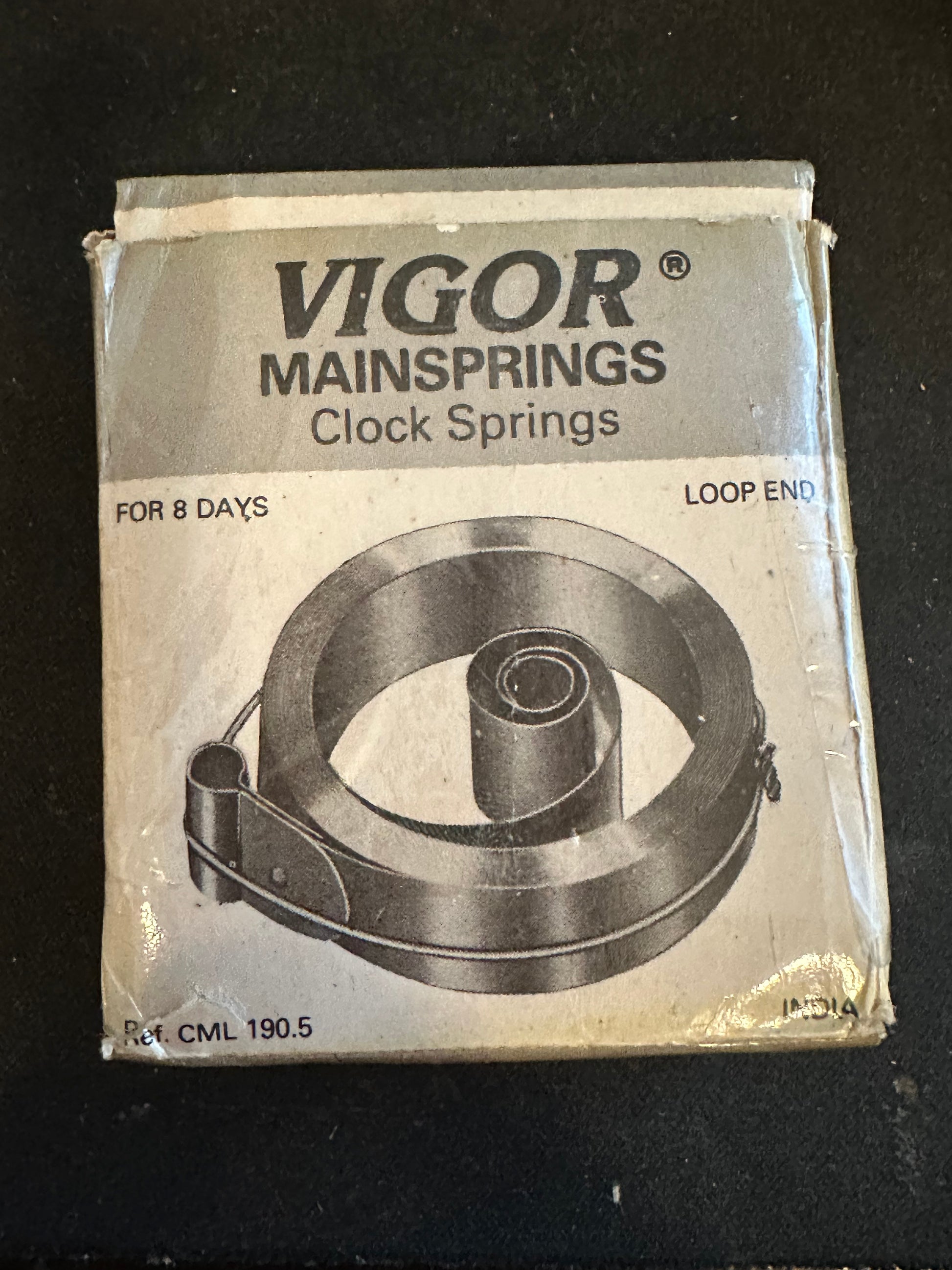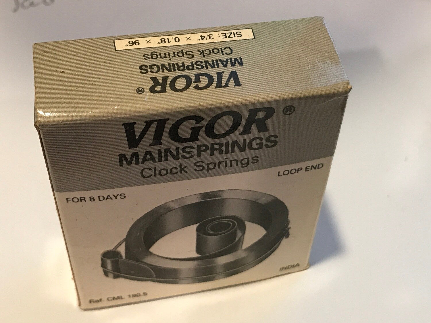 Vigor Clock Mainspring, LOOP End – 3/4″ Width, 0.18″ Strength/Thickness, 96″ Length, P/N CML 190.5, steel, new in frail, well handled box. See images for further details. I specialize is hard to find watch & clock parts and all parts are unconditionally guaranteed. Images do a pretty good job of representing the item