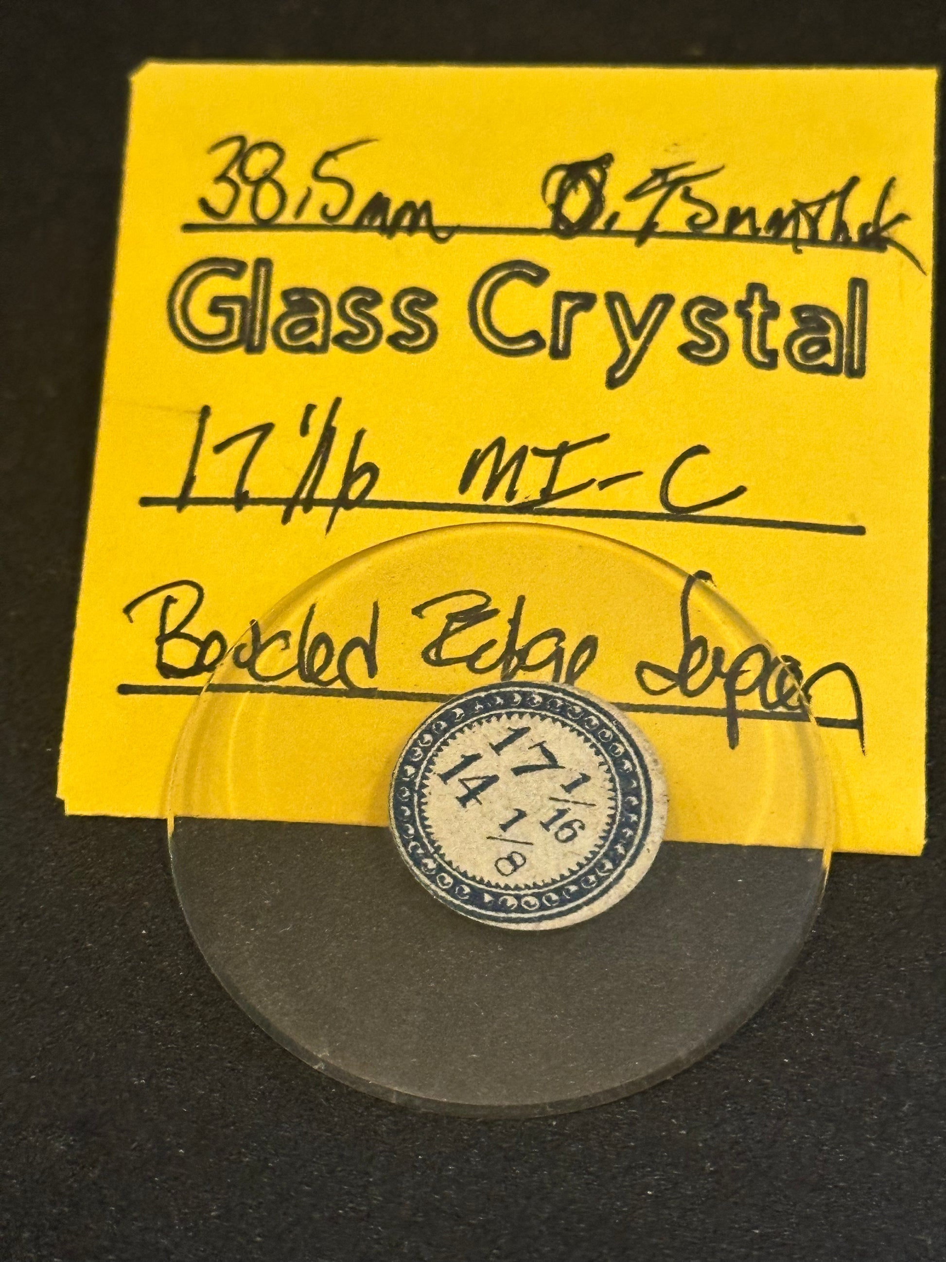 Vintage Beveled Glass Pocket Watch Crystal size 17-1/16 = ~38.5mm with a thickness of ~0.95mm, new old stock. This size is probably for cases 12s or near to it, and is the typical thickness of a stock glass crystal. Beveled edge as was common for the time, these come from bundles of bulk stock crystals made in Japan and sold to back-fill glass crystal cabinets. While still likely well over 100 years old, in my 40 years of experience with them I've not found the older crystals to be any more or less brittle than anything you could find today. I likely have several of these so the one you get may differ slightly from the images. I have a supply of crystals that numbers in the hundreds of thousands so I can usually supply just about any size Watch Crystal you need (glass or acrylic) so feel free to inquire. Images do an adequate job of representing the item.