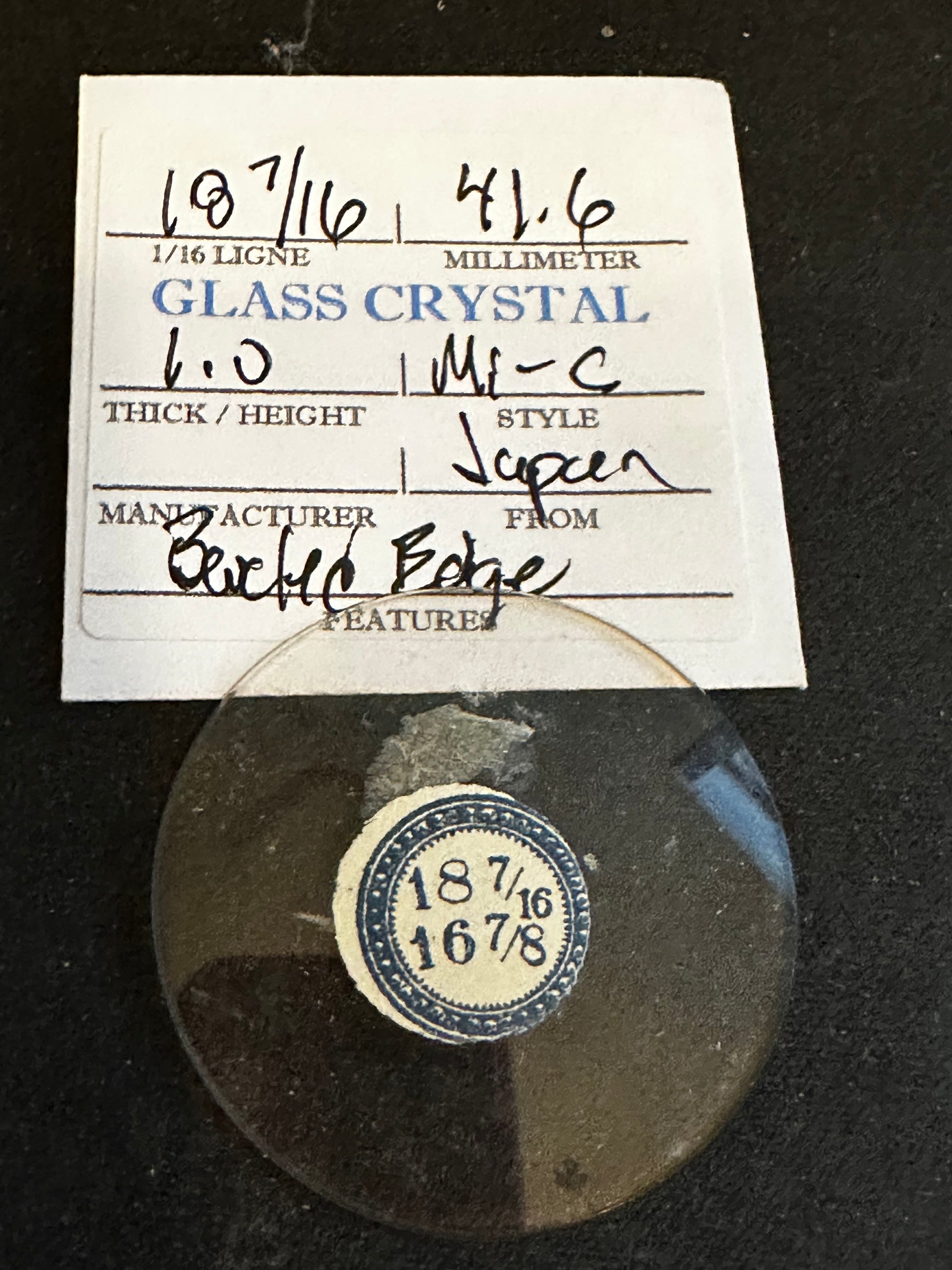 Vintage Beveled Glass Pocket Watch Crystal size 18-7/16 = ~41.6mm with a thickness of ~1.0mm. Beveled edge as was common for the time, these come from bundles of bulk stock crystals made in Japan and sold to back-fill glass crystal cabinets. While still likely well over 100 years old, in my 40 years of experience with them I've not found the older crystals to be any more or less brittle than anything you could find today. That said, they are quite likely dirty and need serious cleaning. I likely have several of these so the one you get may differ slightly from the images. I have a supply of crystals that numbers in the hundreds of thousands so I can usually supply just about any size Watch Crystal you need (glass or acrylic) so feel free to inquire. Images do an adequate job of representing the item.