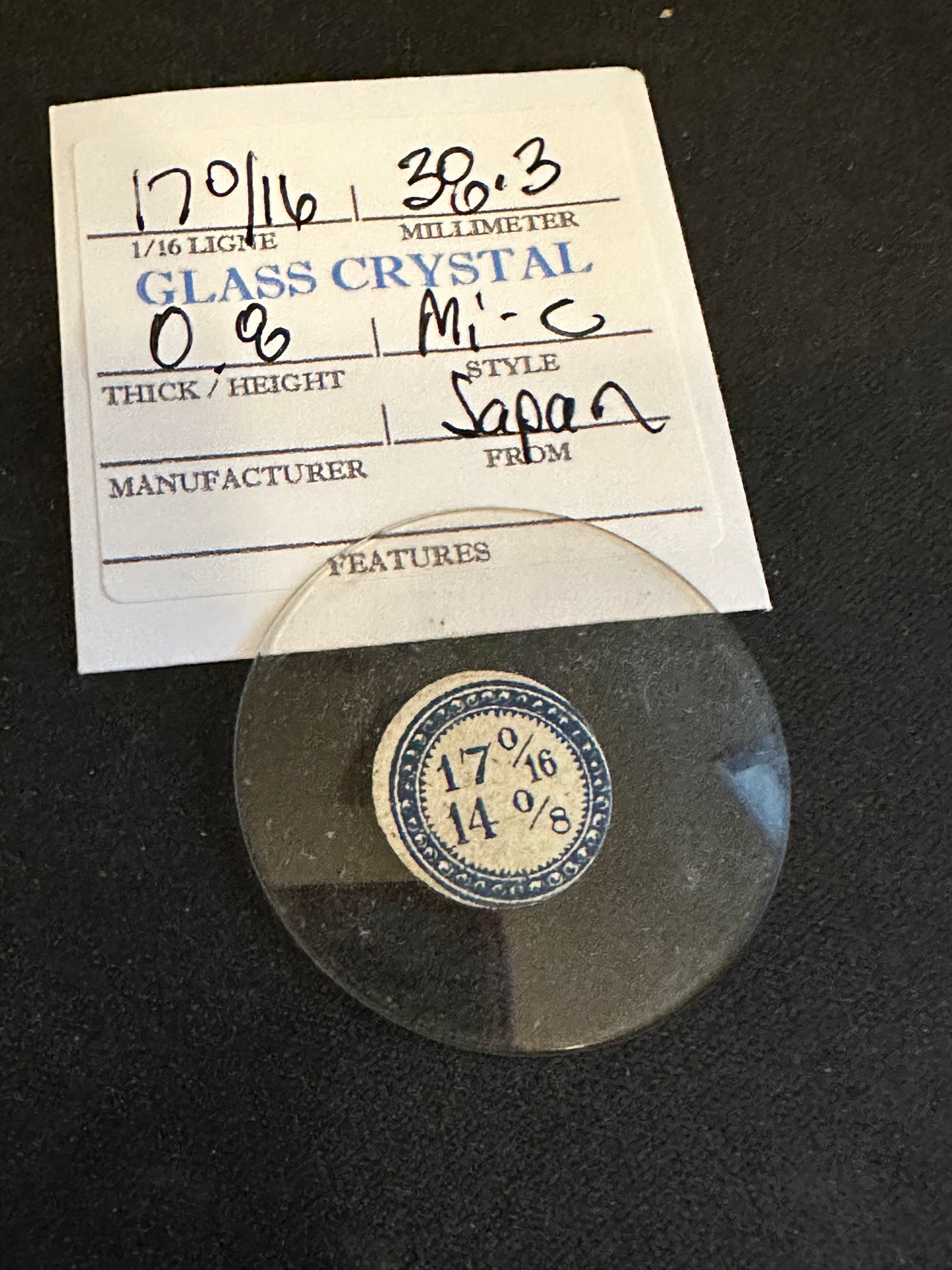 Vintage Beveled Glass Pocket Watch Crystal size 17-0/16 = ~38.3mm with a thickness of ~0.85mm, new old stock. This size is probably for cases 12s or near to it, and is the typical thickness of a stock glass crystal. Beveled edge as was common for the time, these come from bundles of bulk stock crystals made in Japan and sold to back-fill glass crystal cabinets. While still likely well over 100 years old, in my 40 years of experience with them I've not found the older crystals to be any more or less brittle than anything you could find today. I likely have several of these so the one you get may differ slightly from the images. I have a supply of crystals that numbers in the hundreds of thousands so I can usually supply just about any size Watch Crystal you need (glass or acrylic) so feel free to inquire. Images do an adequate job of representing the item.