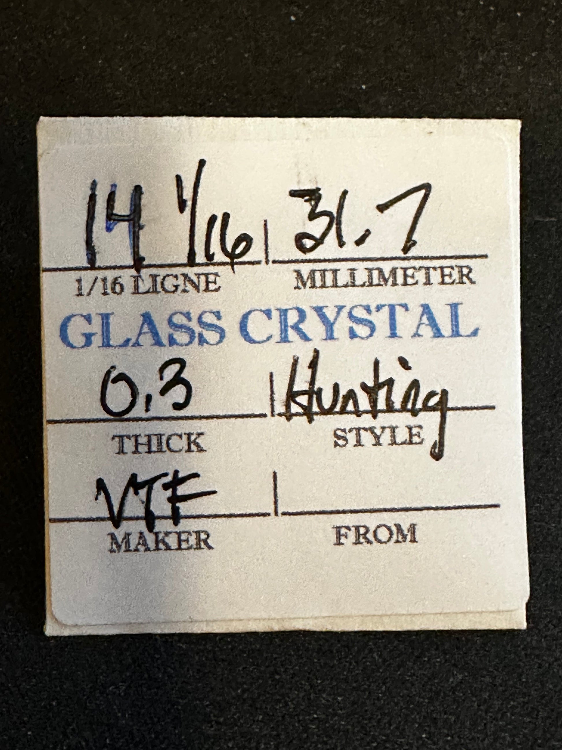 VTF Vintage Glass Hunting Case Watch Crystal size 14-1/16 (~31.7mm) with a height of 7, new old stock. This is the second lowest profile glass hunting crystal for a hunting case movement commonly available at the time. These come from glass crystal cabinets that are easily well over 100 years old, so they give real meaning to the term NOS. That said, in my 40 years of experience with them I've not found the older crystals to be any more or less brittle than anything you could find today, if they made them today. I likely have several of these so the one you get may differ slightly from the images. Glass Hunting crystals take great care in installation so I'll package them so they arrive as described, but you're responsible for proper installation. I have a supply of crystals that numbers in the hundreds of thousands so I can usually supply just about any size Watch Crystal you need (glass or acrylic) so feel free to inquire. Images do an adequate job of representing the item.