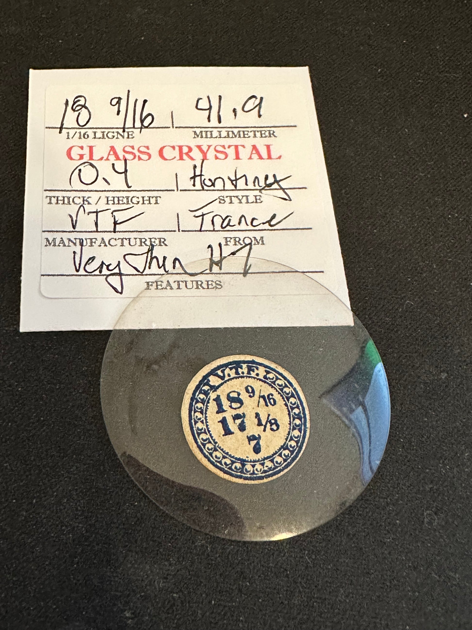 VTF Vintage Glass Hunting Case Watch Crystal size 18-9/16 (~41.9mm), ~ 0.4mm thick which is pretty thin, with a height of 7, new old stock. These come from glass crystal cabinets that are easily well over 100 years old, so they give real meaning to the term NOS. That said, in my 40 years of experience with them I've not found the older crystals to be any more or less brittle than anything you could find today, if they made them today. I likely have several of these so the one you get may differ slightly from the images. Glass Hunting crystals take great care in installation so I'll package them so they arrive as described, but you're responsible for proper installation. I have a supply of crystals that numbers in the hundreds of thousands so I can usually supply just about any size Watch Crystal you need (glass or acrylic) so feel free to inquire. Images do an adequate job of representing the item.