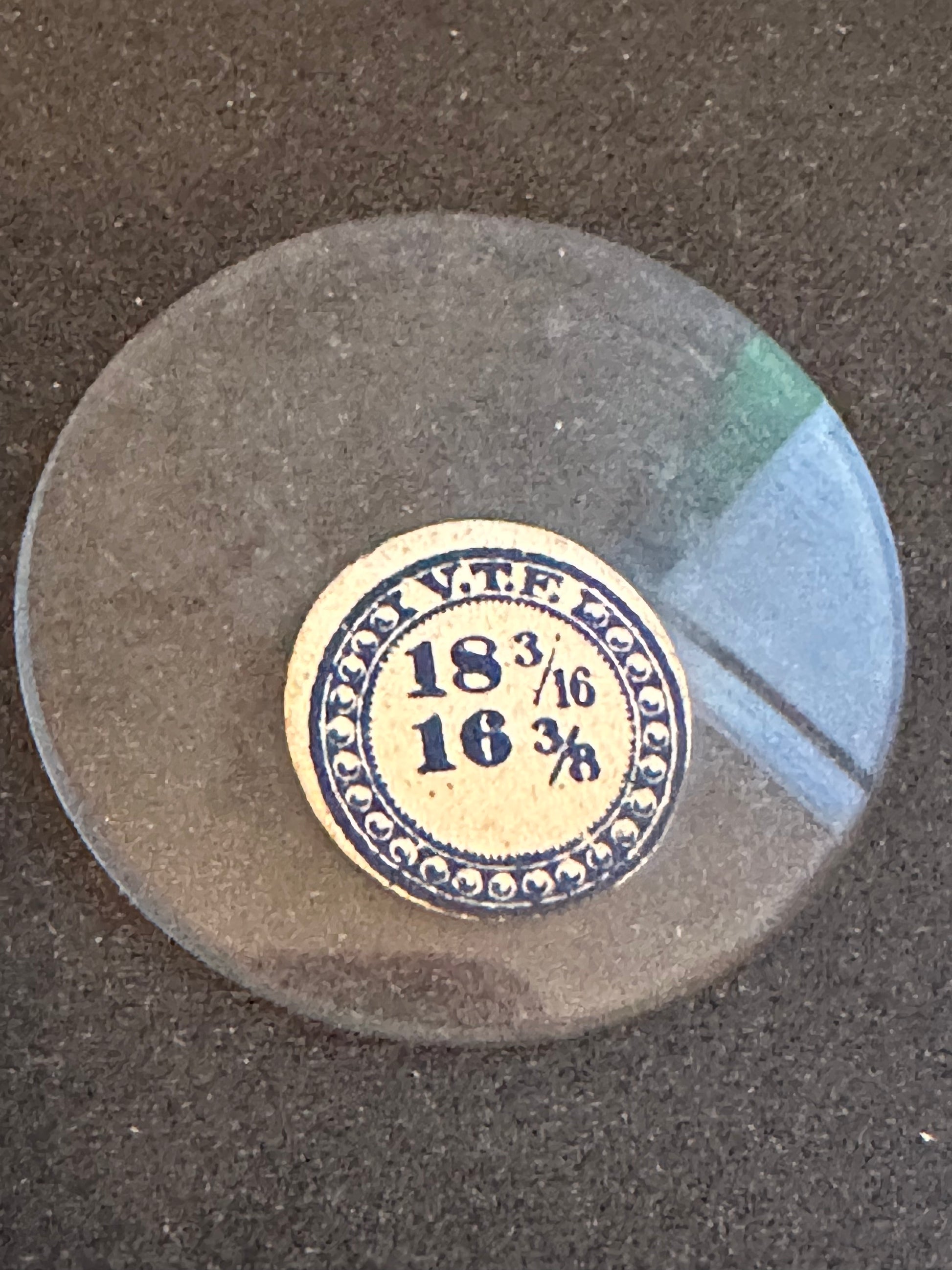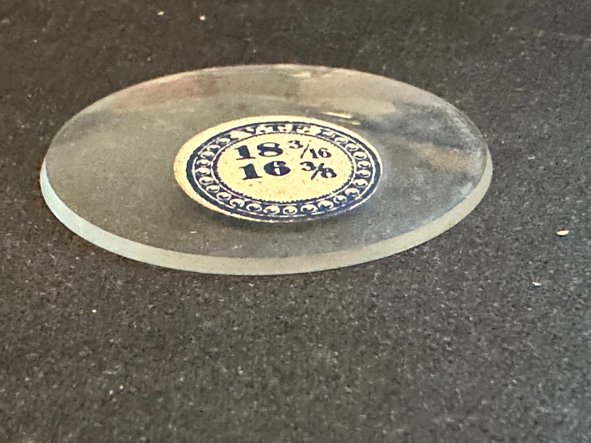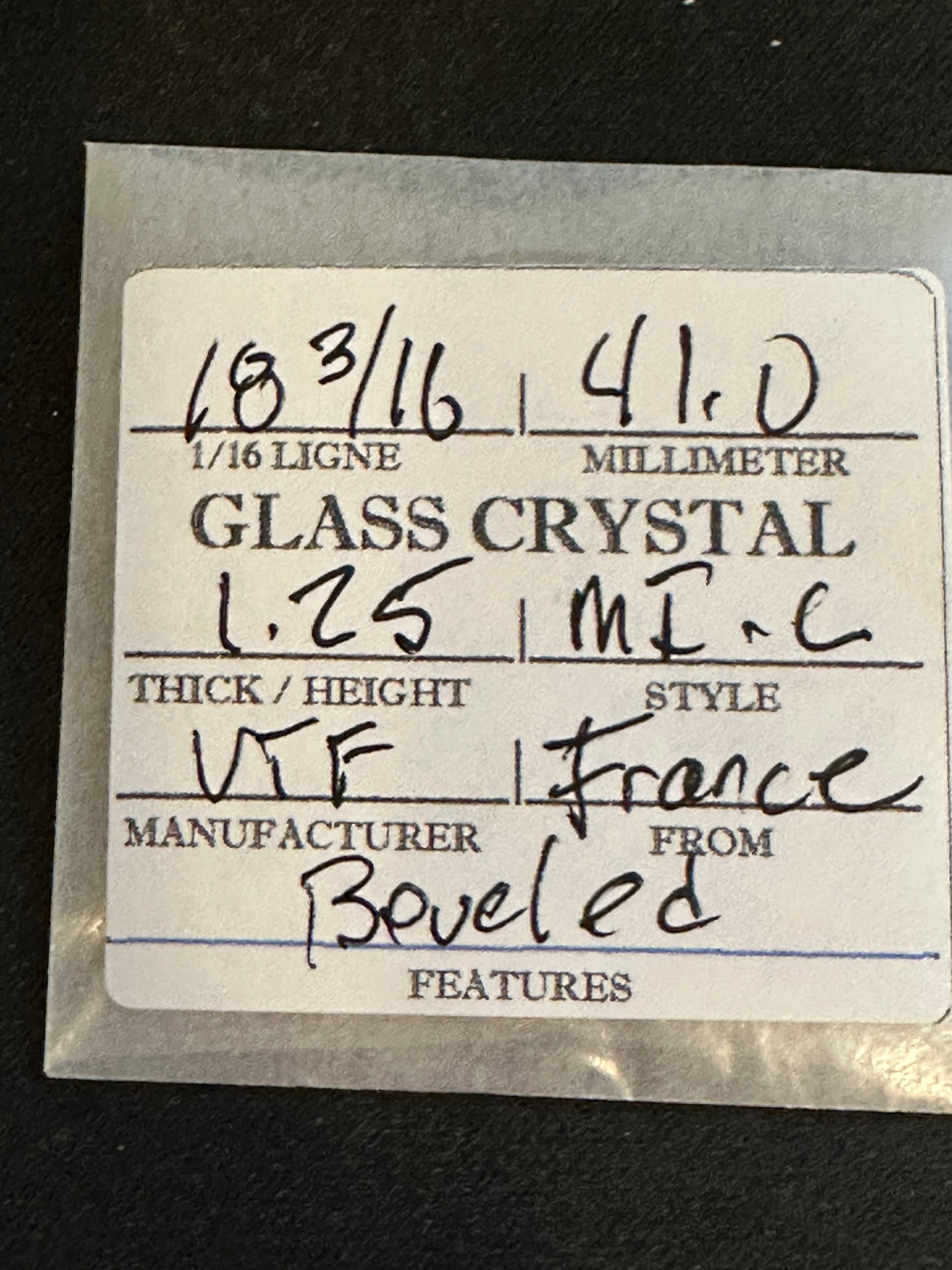 VTF Vintage Glass Pocket Watch Crystal size 18-3/16 = ~41.0mm with a thickness of ~1.25mm. A somewhat thicker Mi-Concave profile with a pronounced bevel, typical of what originally came on larger vintage pocket watches. While still likely well over 100 years old, in my 40 years of experience with them I've not found the older crystals to be any more or less brittle than anything you could find today. That said, they are quite likely very dirty and need serious cleaning. I have a supply of crystals that numbers in the hundreds of thousands so I can usually supply just about any size Watch Crystal you need (glass or acrylic) so feel free to inquire. Images do an adequate job of representing the item.