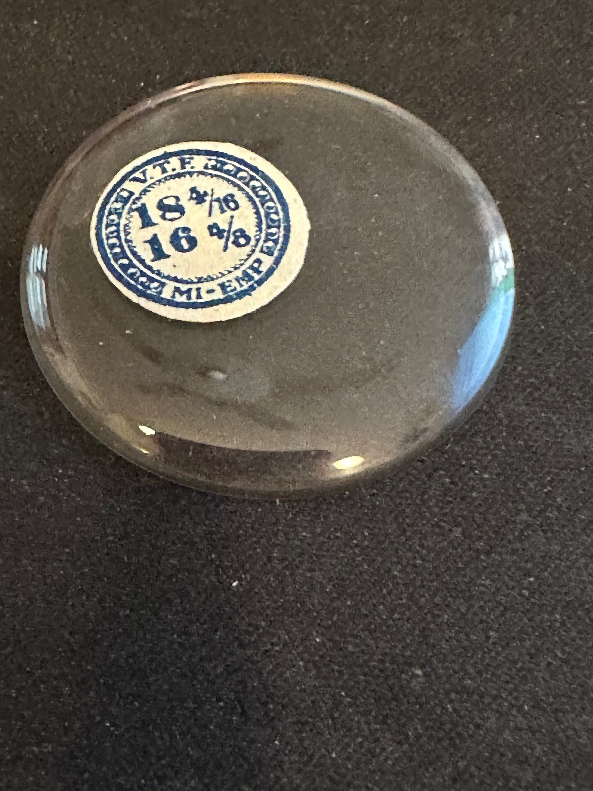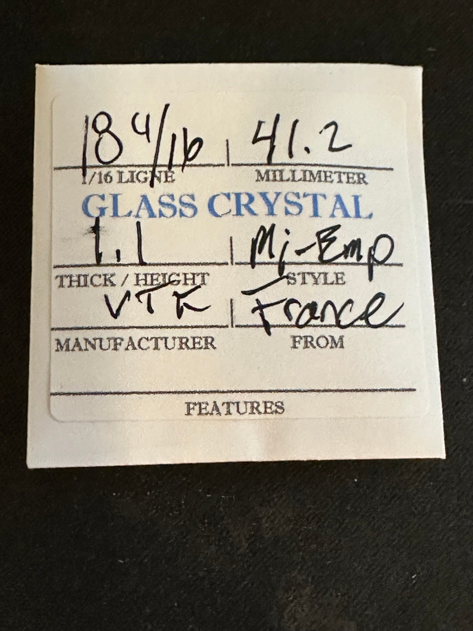 VTF Vintage Glass Pocket Watch Crystal size 18-4/16 = ~41.2mm with a thickness of ~1.1mm. VTF called this a MI-Empire profile crystal which is really just a flatter dome concave crystal with a slight edge to match the inner curve of the bezel. While still likely well over 80 years old, in my 40 years of experience with them I've not found the older crystals to be any more or less brittle than anything you could find today. That said, they are quite likely dirty and need serious cleaning. I have a supply of crystals that numbers in the hundreds of thousands so I can usually supply just about any size Watch Crystal you need (glass or acrylic) so feel free to inquire. Images do an adequate job of representing the item.