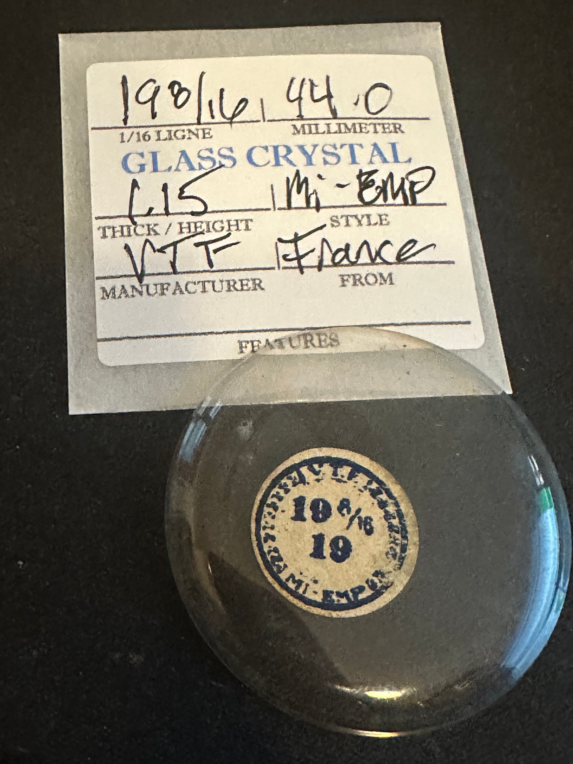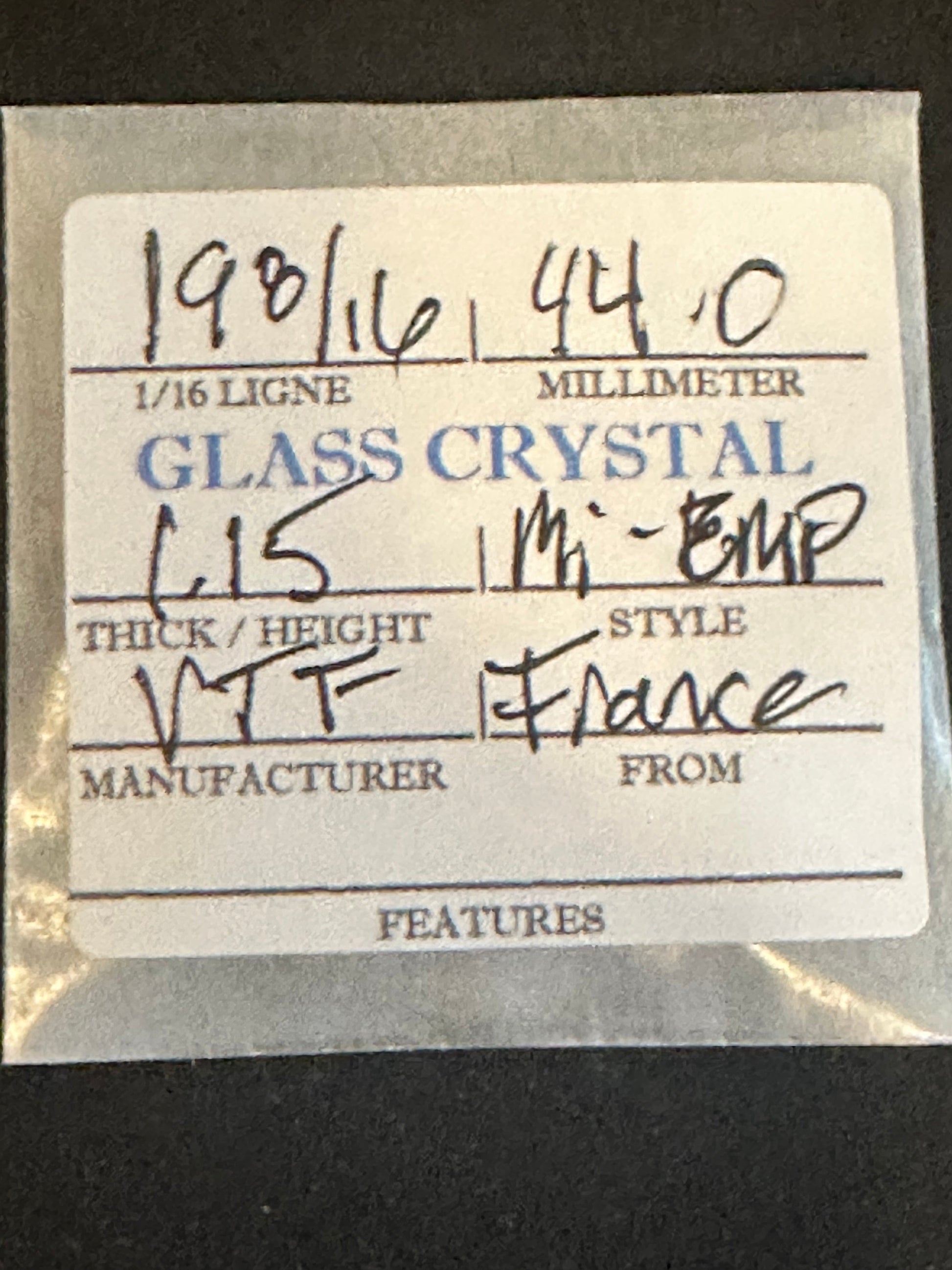 VTF Vintage Glass Pocket Watch Crystal size 19-8/16 = ~44.0mm with a thickness of ~1.15mm. VTF called this a MI-Empire profile crystal which is really just a flatter dome concave crystal with a slight edge to match the inner curve of the bezel. While still likely well over 80 years old, in my 40 years of experience with them I've not found the older crystals to be any more or less brittle than anything you could find today. That said, they are quite likely dirty and need serious cleaning. I have a supply of crystals that numbers in the hundreds of thousands so I can usually supply just about any size Watch Crystal you need (glass or acrylic) so feel free to inquire. Images do an adequate job of representing the item.