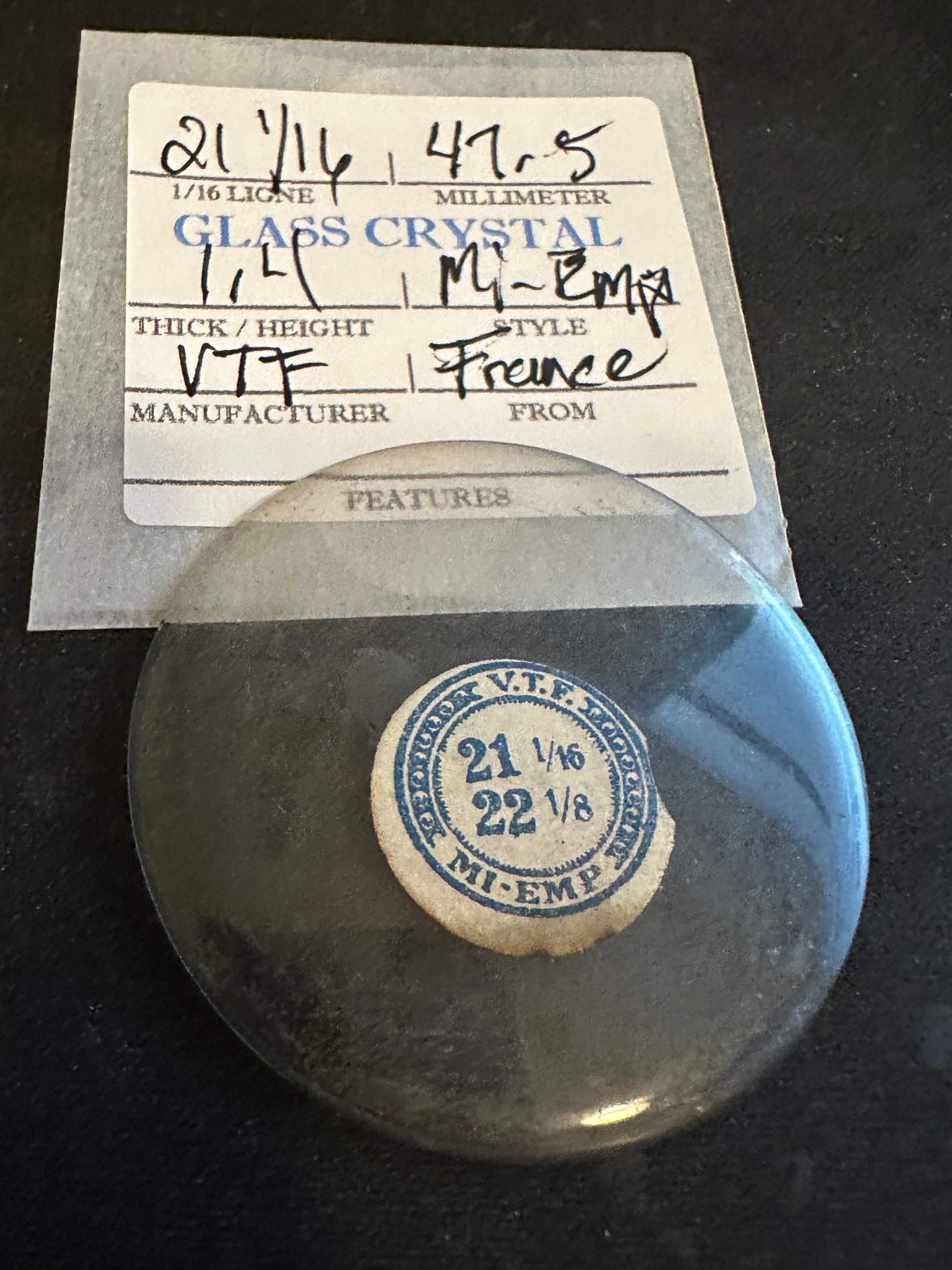 VTF Vintage Glass Pocket Watch Crystal size 21-1/16 = ~47.5mm with a thickness of ~1.4mm. VTF called this a Mi-Empire profile crystal which is really just a flatter dome concave crystal with a slight edge to match the inner curve of the bezel. Speaking of the edge, this particular crystal has one very minor rough area along the edge (see photo) that will be hidden by the bezel when properly installed. While still likely well over 80 years old, in my 40 years of experience with them I've not found the older crystals to be any more or less brittle than anything you could find today. That said, they are quite likely dirty and need serious cleaning. I have a supply of crystals that numbers in the hundreds of thousands so I can usually supply just about any size Watch Crystal you need (glass or acrylic) so feel free to inquire. Images do an adequate job of representing the item.