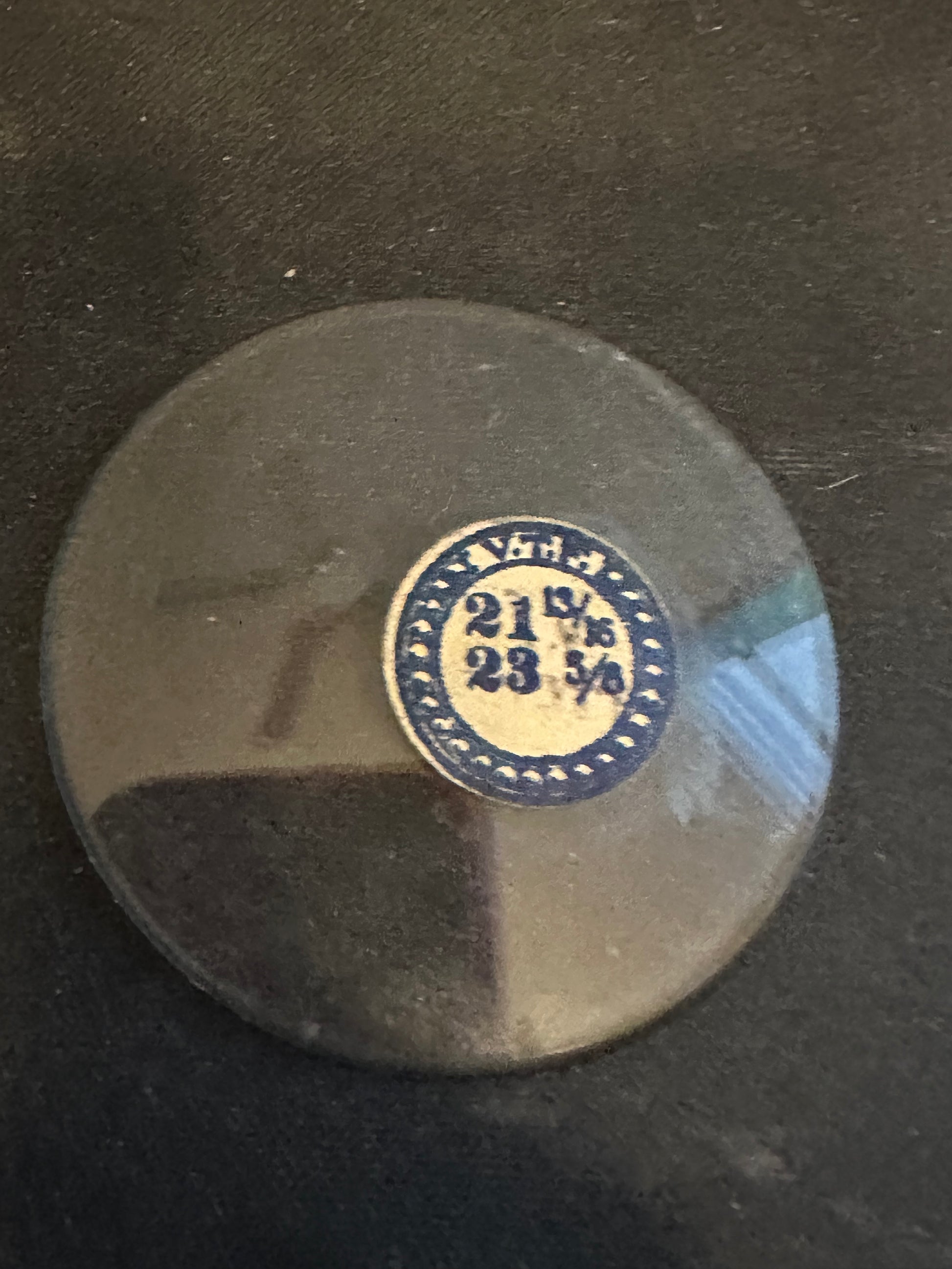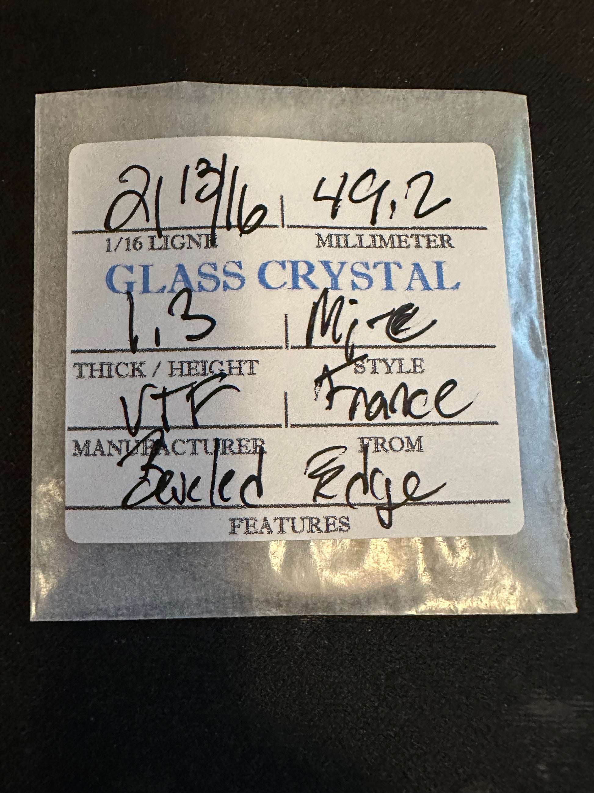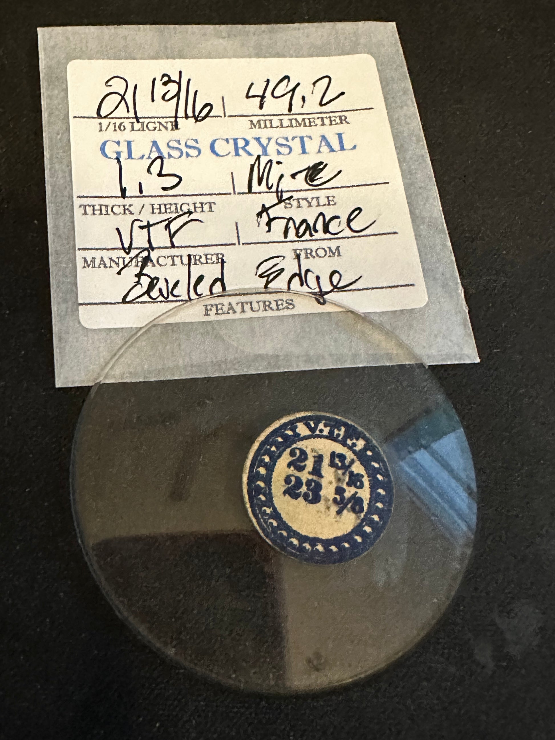 VTF Vintage Glass Pocket Watch Crystal size 21-13/16 = ~49.2mm with a thickness of ~1.3mm. A considerably thicker Mi-Concave profile with a pronounced bevel, typical of what originally came on larger vintage pocket watches. While still likely well over 100 years old, in my 40 years of experience with them I've not found the older crystals to be any more or less brittle than anything you could find today. That said, they are quite likely very dirty and need serious cleaning. I have a supply of crystals that numbers in the hundreds of thousands so I can usually supply just about any size Watch Crystal you need (glass or acrylic) so feel free to inquire. Images do an adequate job of representing the item.