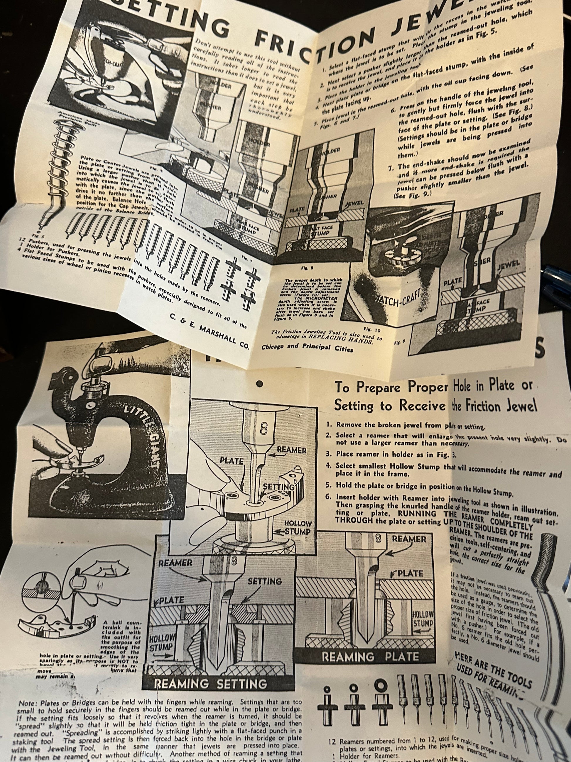 C&E Marshall Jeweling tool in wood box in overall very good condition. Not all sets had all the pushers and reamers and this one does appear to have all of the pieces along with a few extras. Modern Bergeon models made today cost a whole bunch of money so this one is a great set for a reasonable cost. Perhaps not as fancy as a Seitz tool but works just the same. The outer wood box is in fantastic shape for the age, no significant damage. Comes with everything show which includes the simple instructions that came with it although I'm pretty sure these are copies. Images do a suitable job of representing the item, and while I think it's priced reasonably, don't be shy about sending offers.