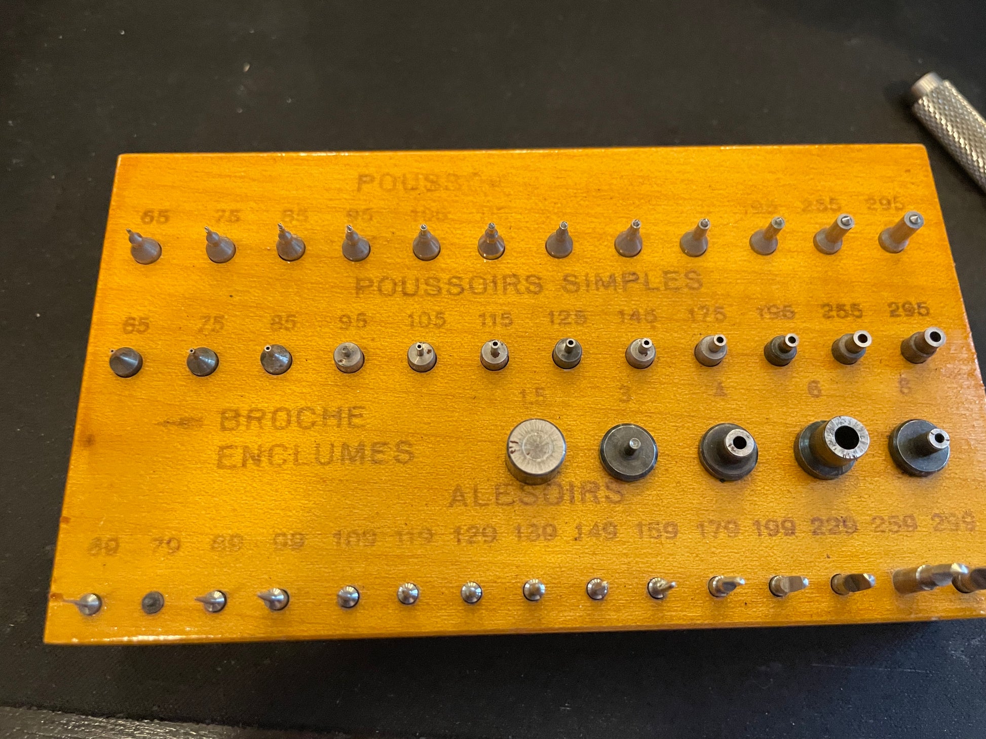 Seitz Jeweling tool in box in overall fantastic condition. The only thing that is not perfect is reamer 79 which is broken but present - these are still replaceable from Bergeon. Not all sets had all the pushers and reamers and this one does appear to have all of the pieces. The modern Bergeon models made today cost a whole bunch of money so this one is a great set. The outer box is in fantastic shape for the age, no significant damage. Anyhow, comes with everything show and I'll throw in an unbound Seitz manual reprint. Images do a suitable job of representing the item, and while I think it's priced reasonably, don't be shy about sending offers.