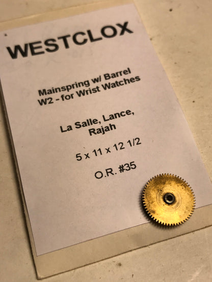 Westclox Model W2 Mainspring with attached barrel for Lance, Rajah and perhaps other Westclox Model W-2 Wrist Ben Watches from the late 1930's until the early 1940's (and perhaps beyond) distributed by Hammel, Riglander & Co in New York, O.R. #35. Will need to be cleaned and lubricated properly before use since they've been on the shelf for over 60 years. I specialize in hard to find watch parts and all watch parts are unconditionally guaranteed. See image for precise characteristics. Images do a suitable job of representing the item.